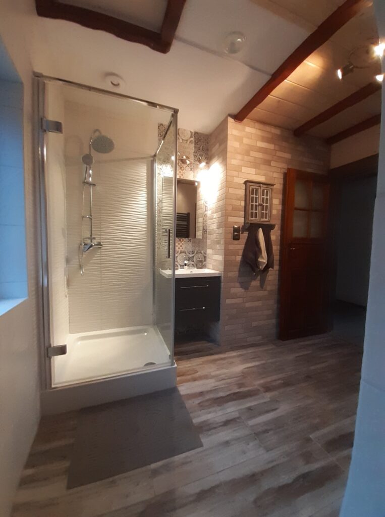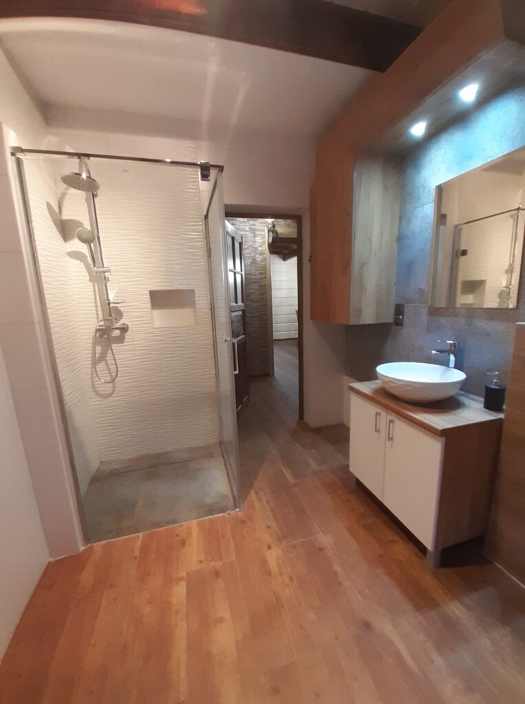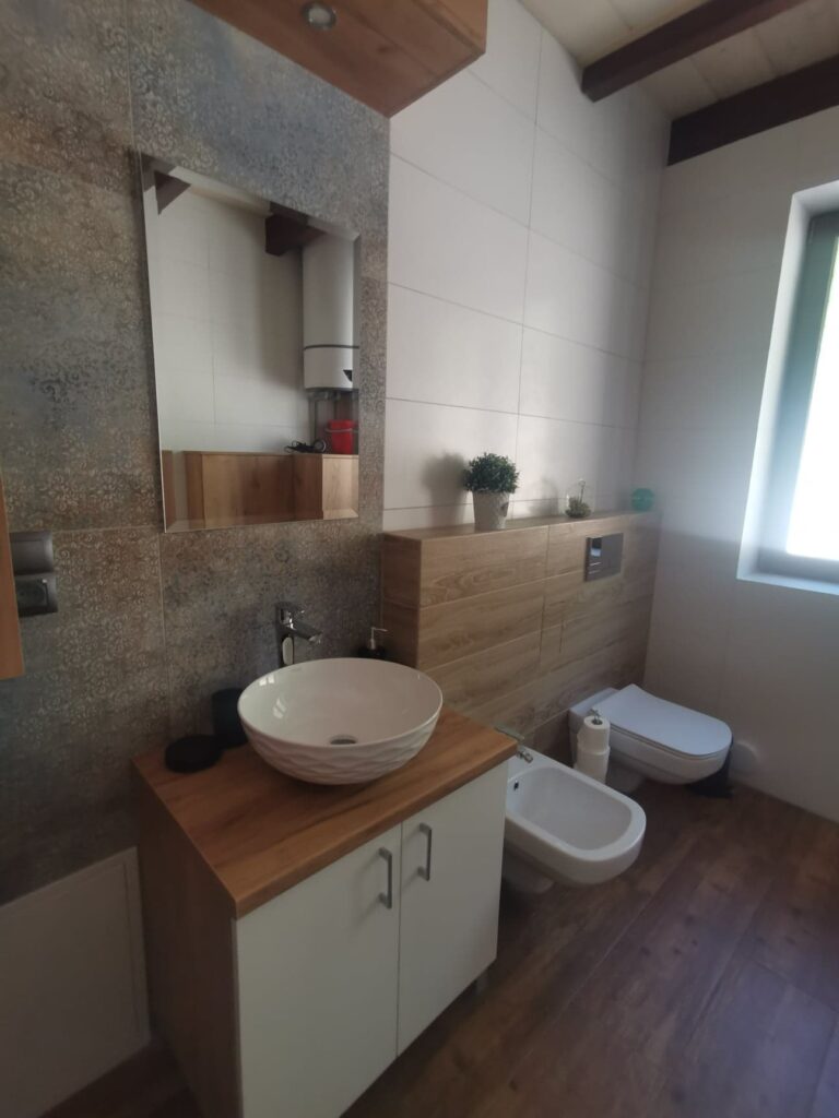 Dwie wyposażone łazienki z bidetem, wc, prysznicami, pralką, suszarką do włosów oraz na ubrania, ręczniki.