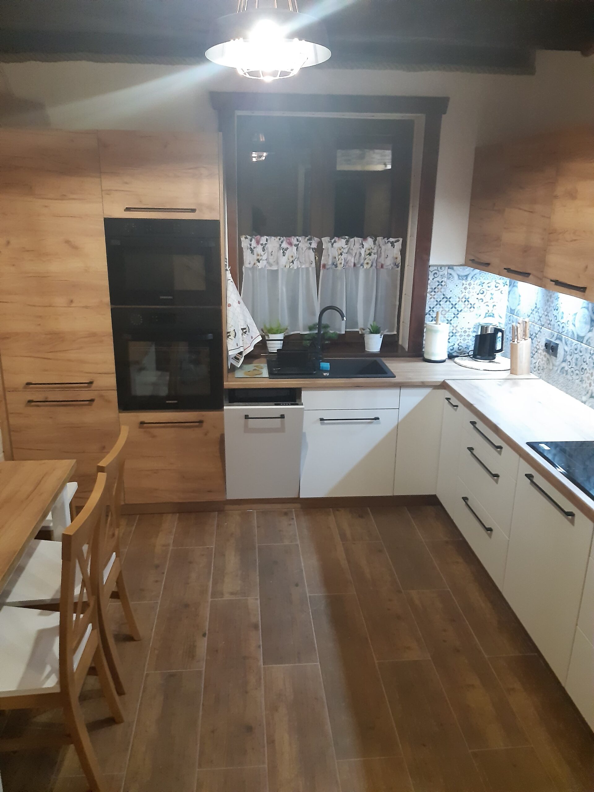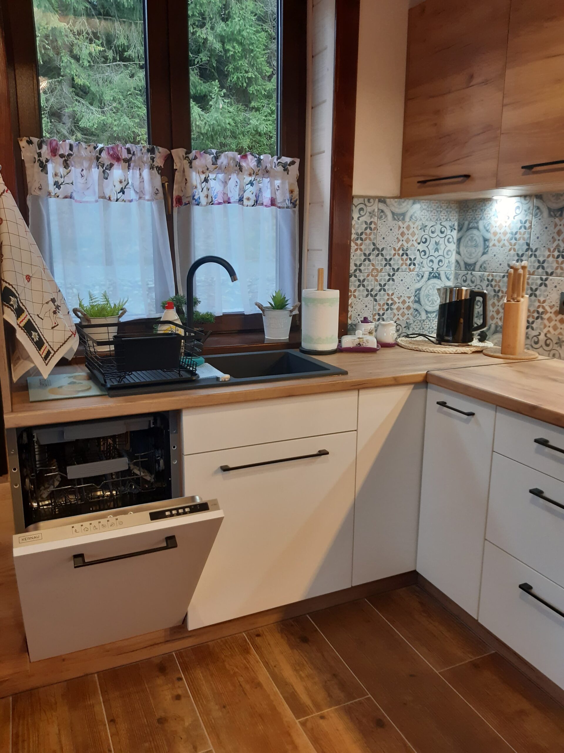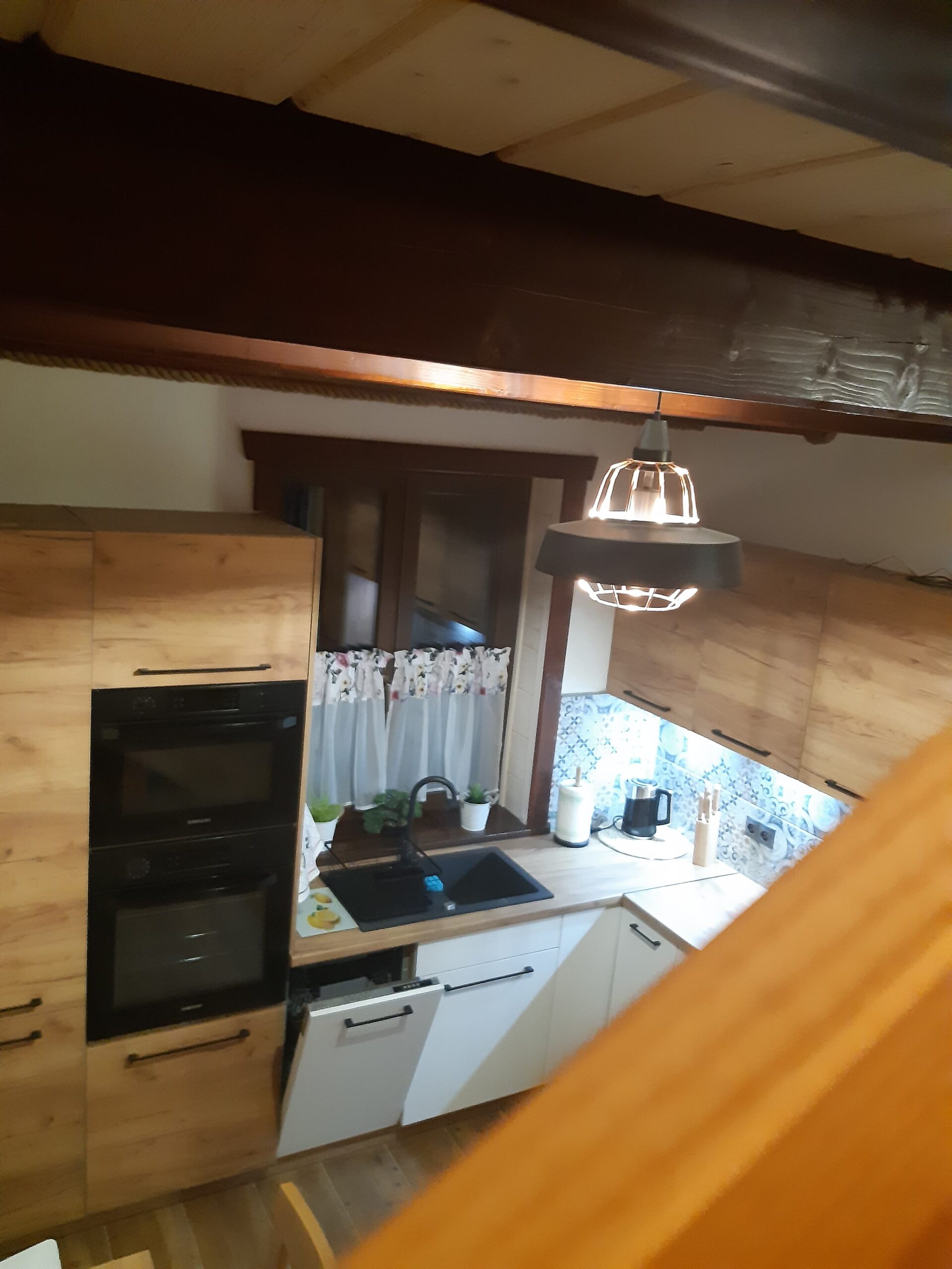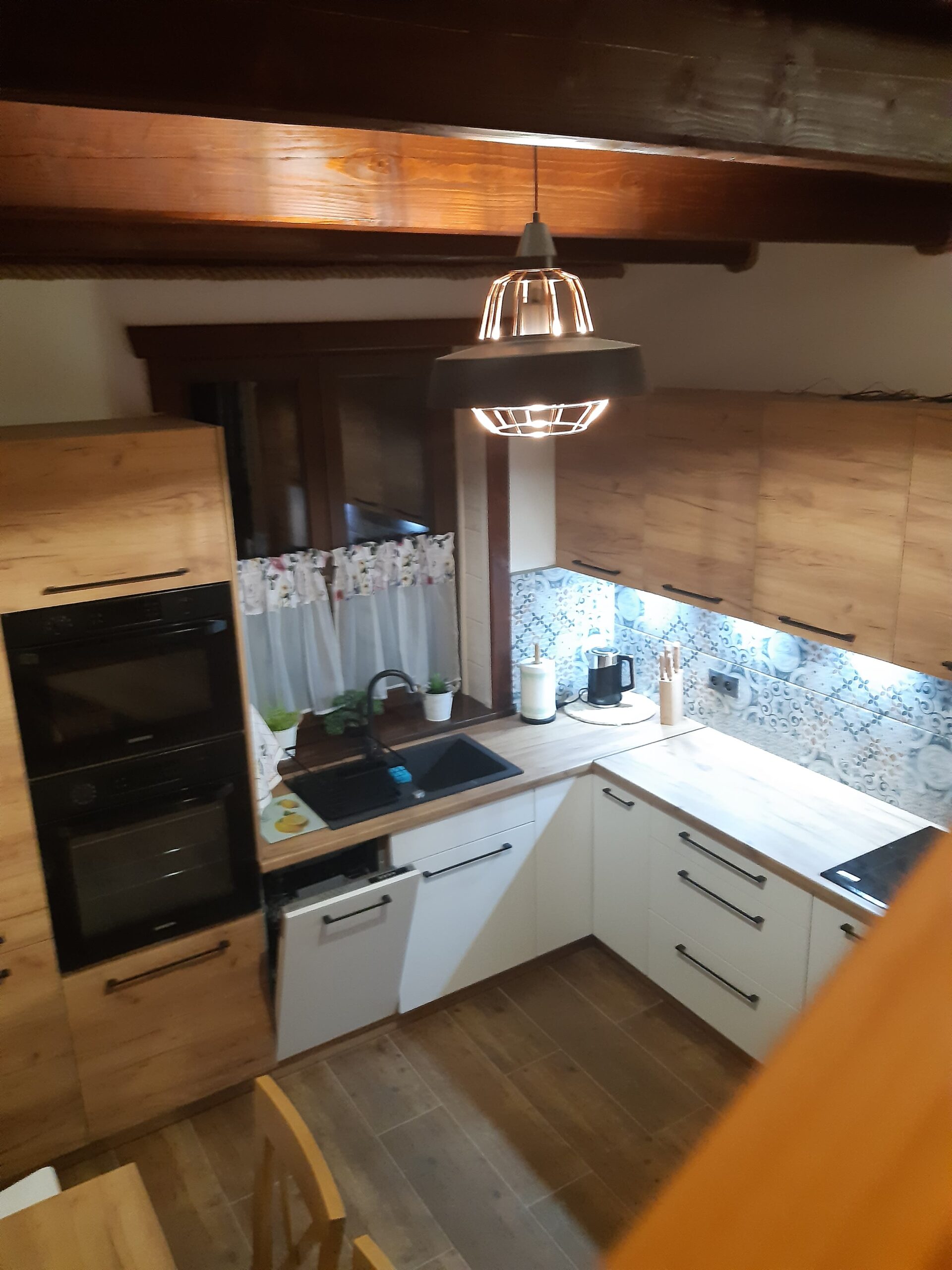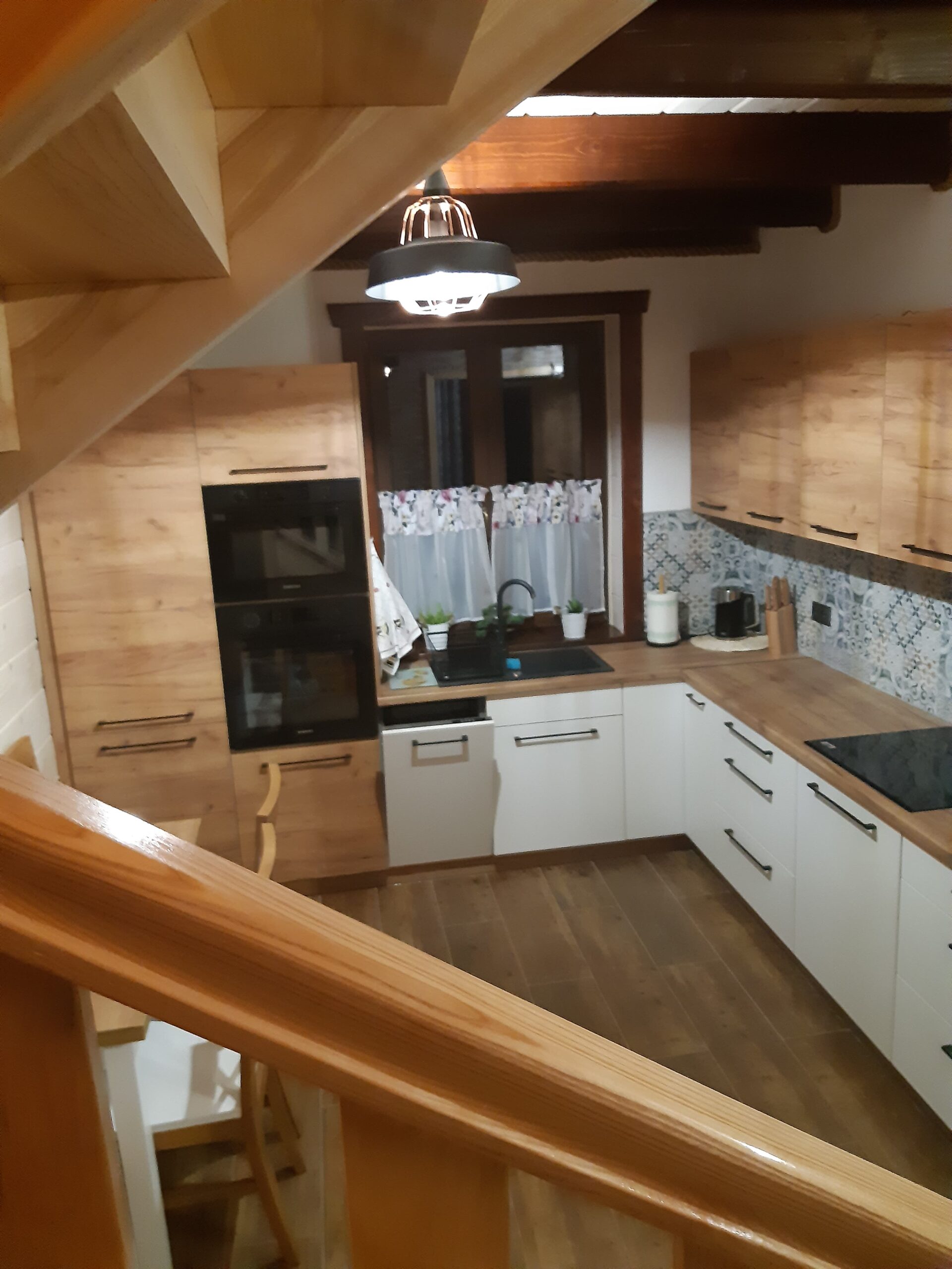 Kuchnia jest oddzielona od salonu. W pełni wyposażona: lodówka z zamrażalnikiem, zabudowana mikrofalówka i piekarnik, zmywarka, płyta indukcyjna, stół z krzesłami, czajnik, mikser, naczynia, garnki, sztućce i wszystkie niezbędne rzeczy..