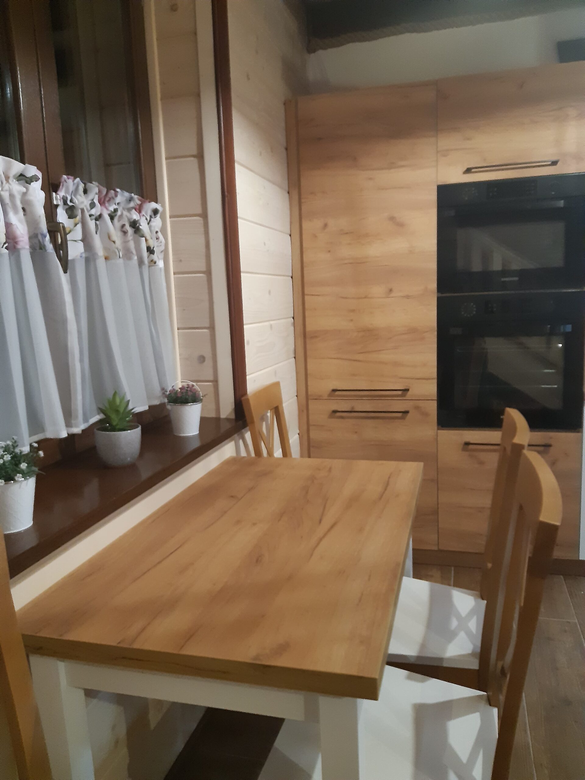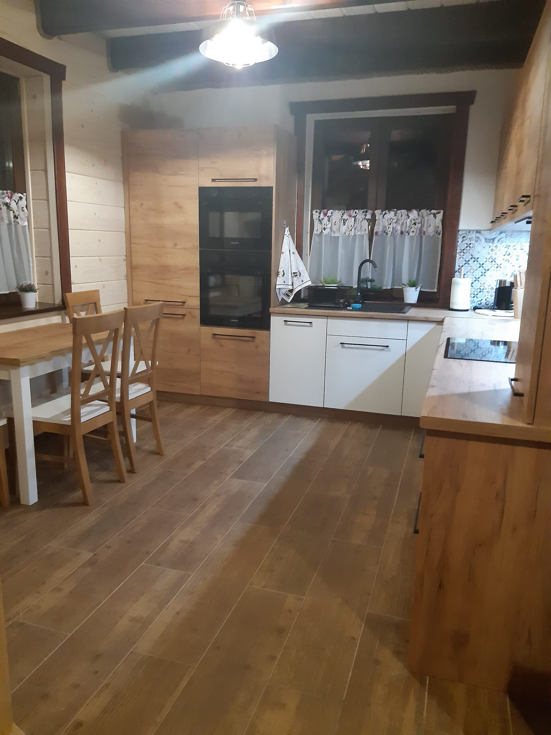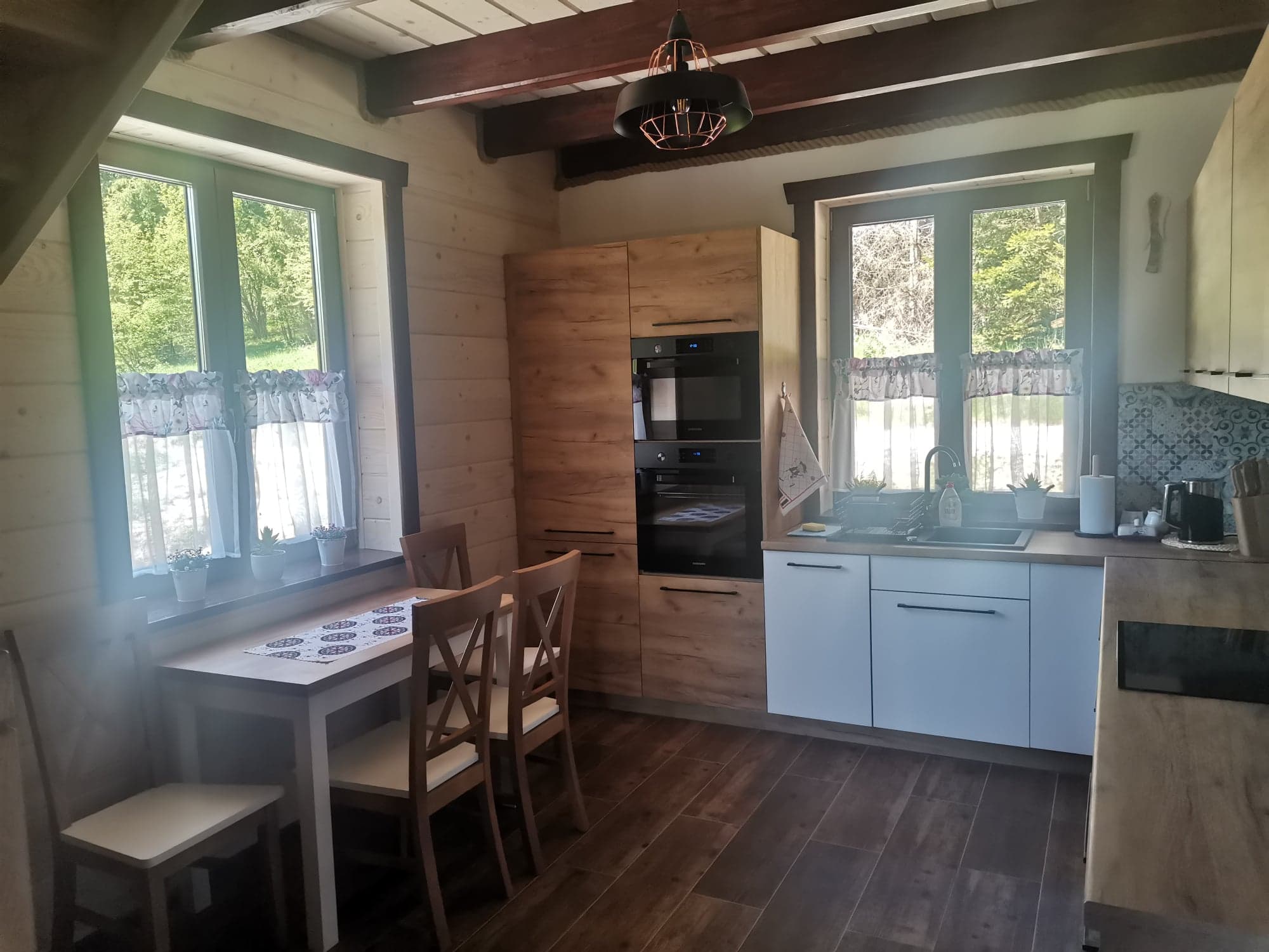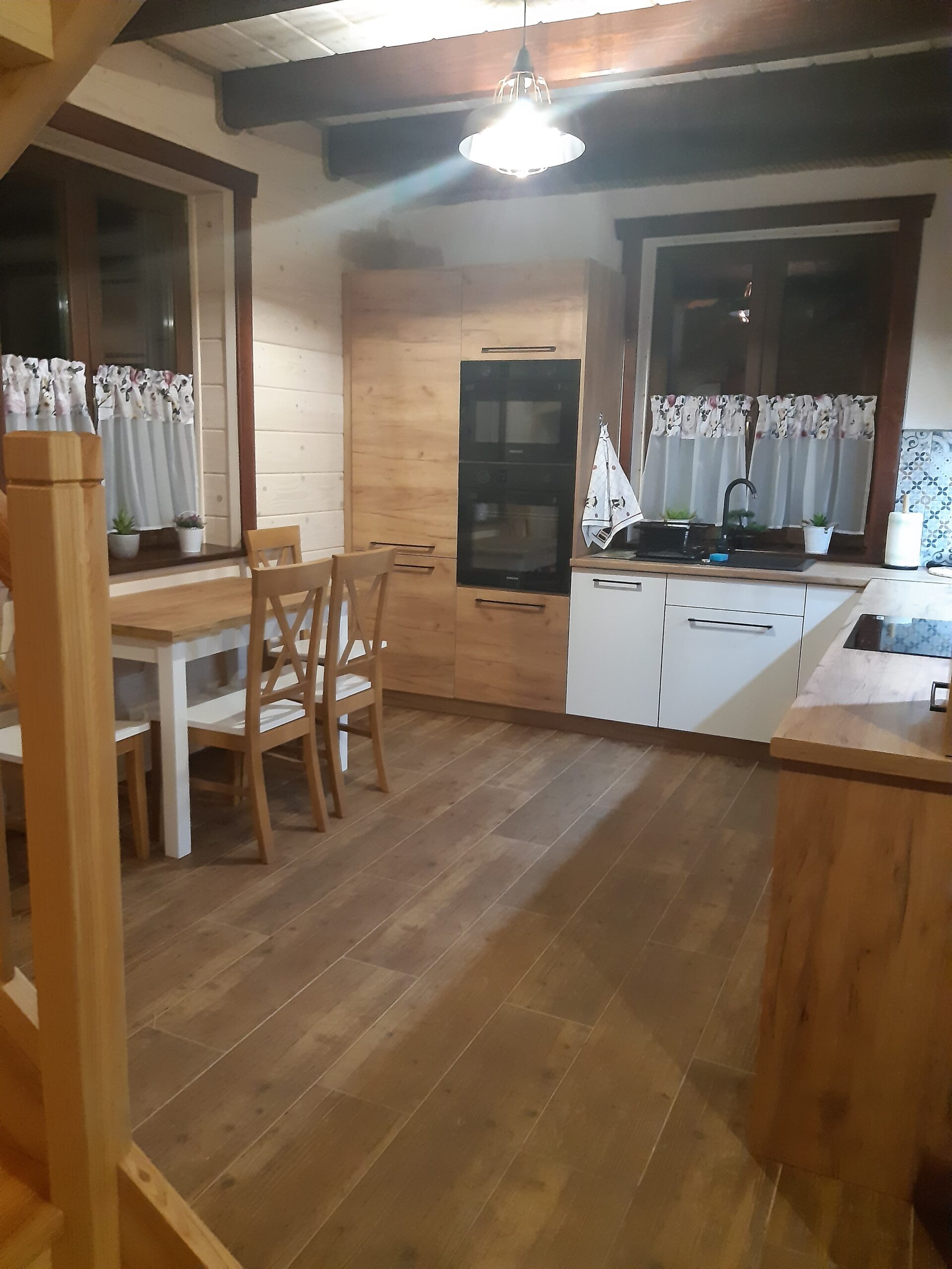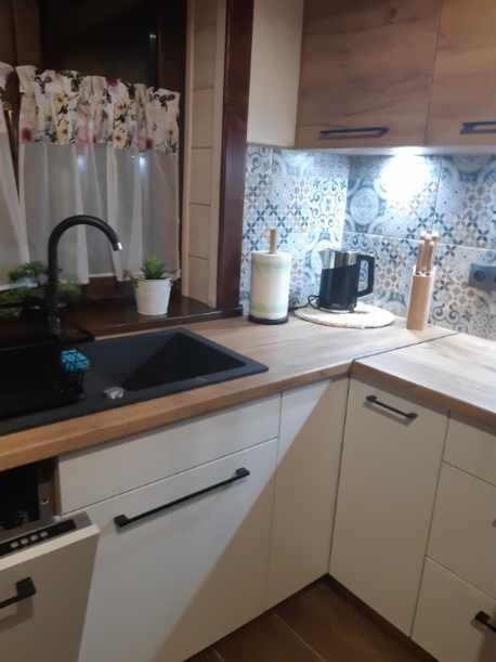 Kuchnia jest oddzielona od salonu. W pełni wyposażona: lodówka z zamrażalnikiem, zabudowana mikrofalówka i piekarnik, zmywarka, płyta indukcyjna, stół z krzesłami, czajnik, mikser, naczynia, garnki, sztućce i wszystkie niezbędne rzeczy..