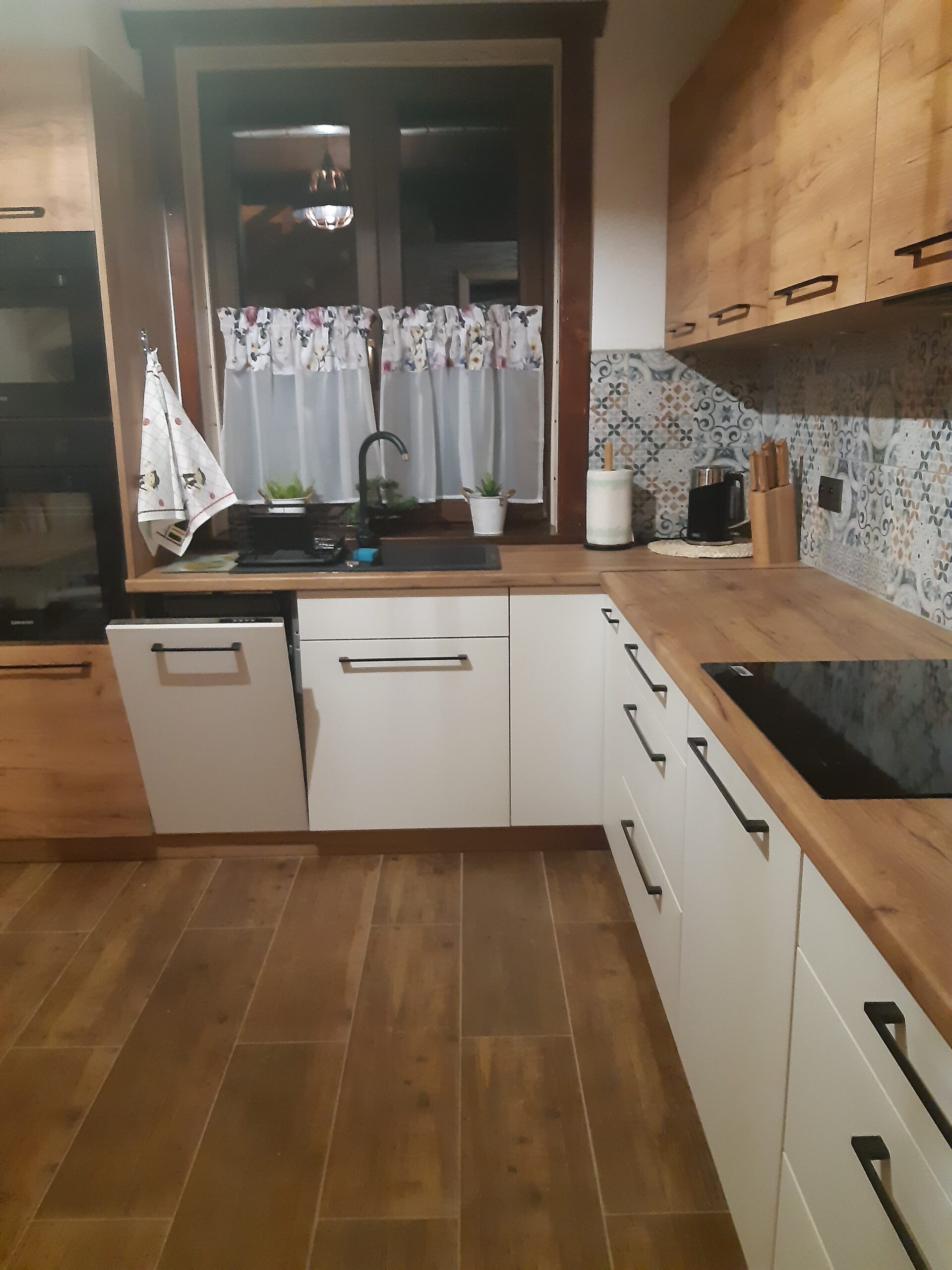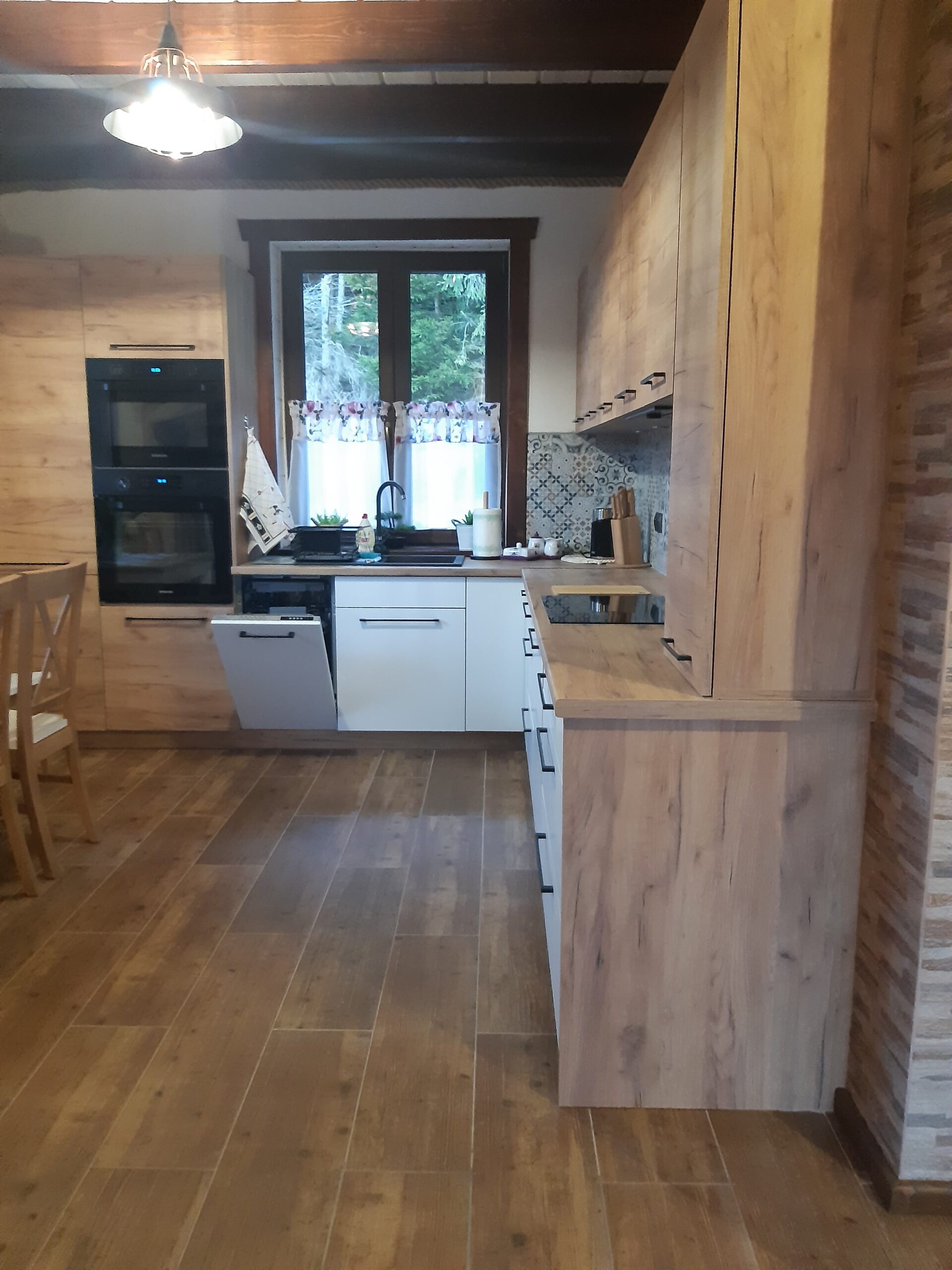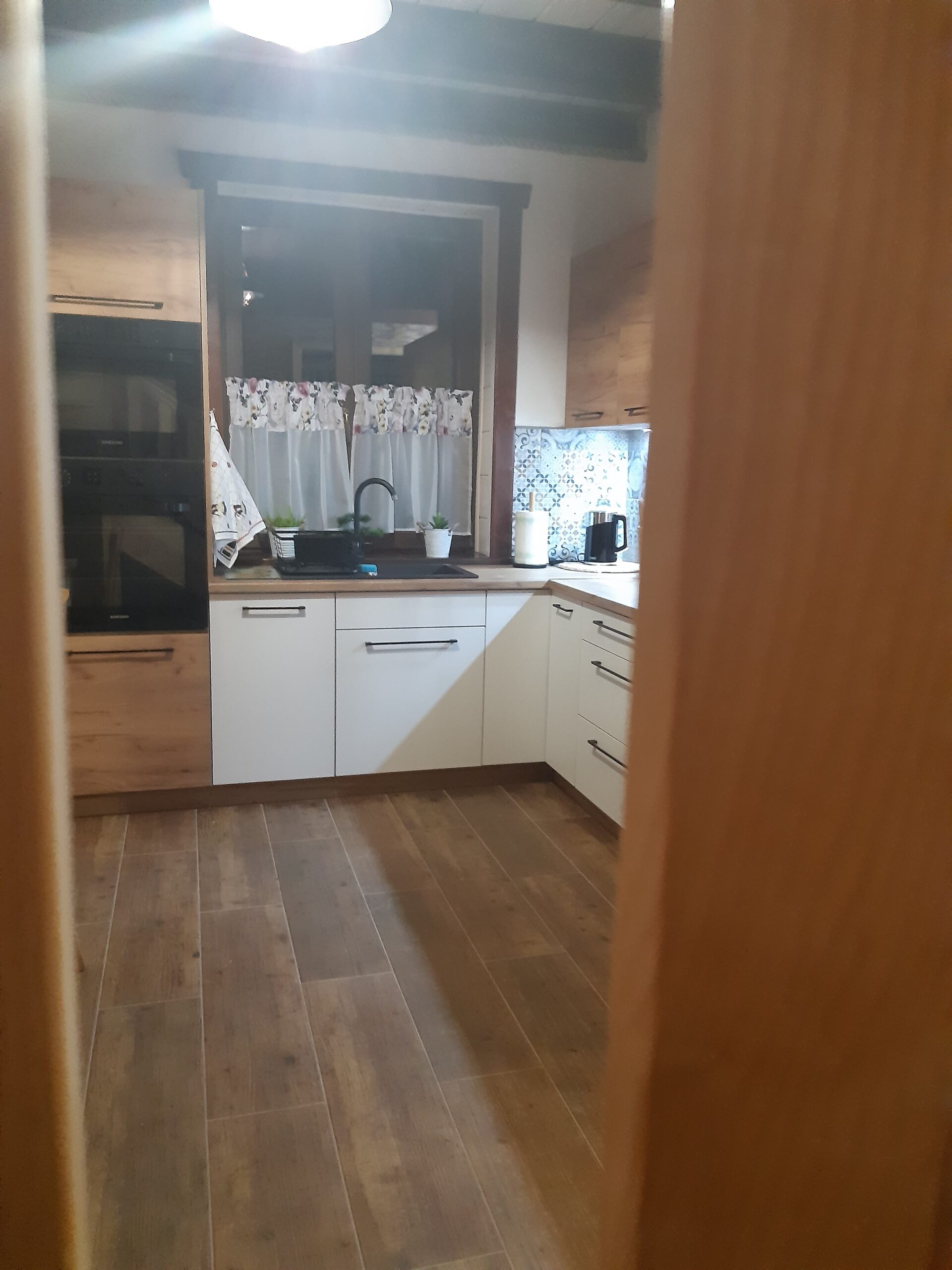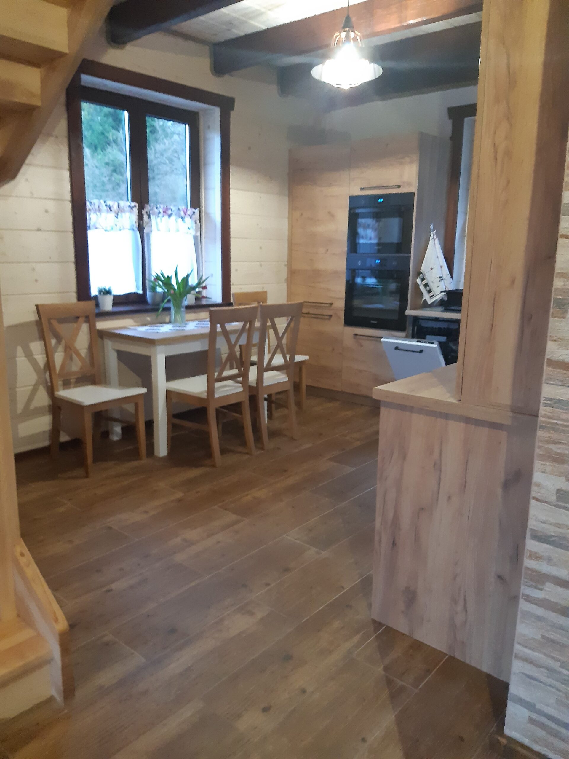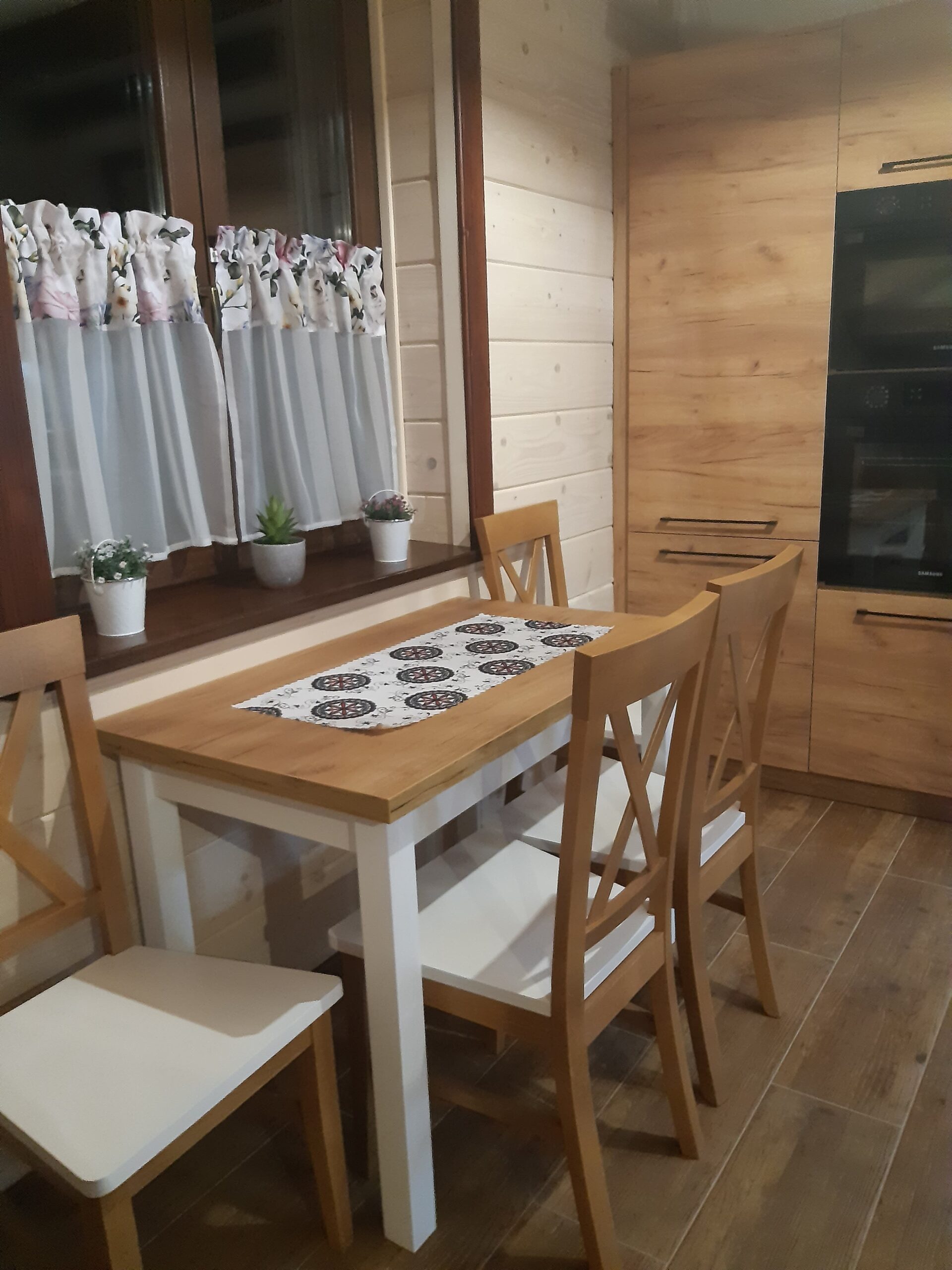 Kuchnia jest oddzielona od salonu. W pełni wyposażona: lodówka z zamrażalnikiem, zabudowana mikrofalówka i piekarnik, zmywarka, płyta indukcyjna, stół z krzesłami, czajnik, mikser, naczynia, garnki, sztućce i wszystkie niezbędne rzeczy..