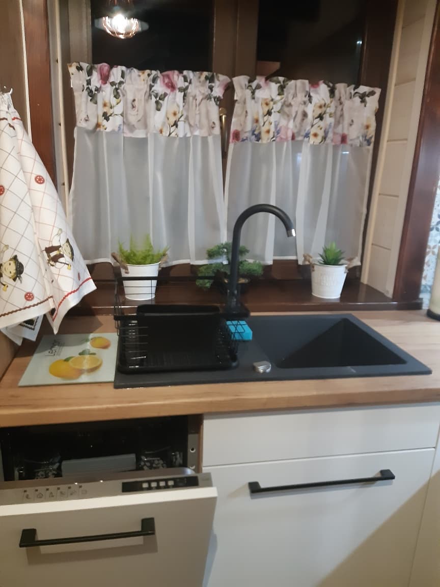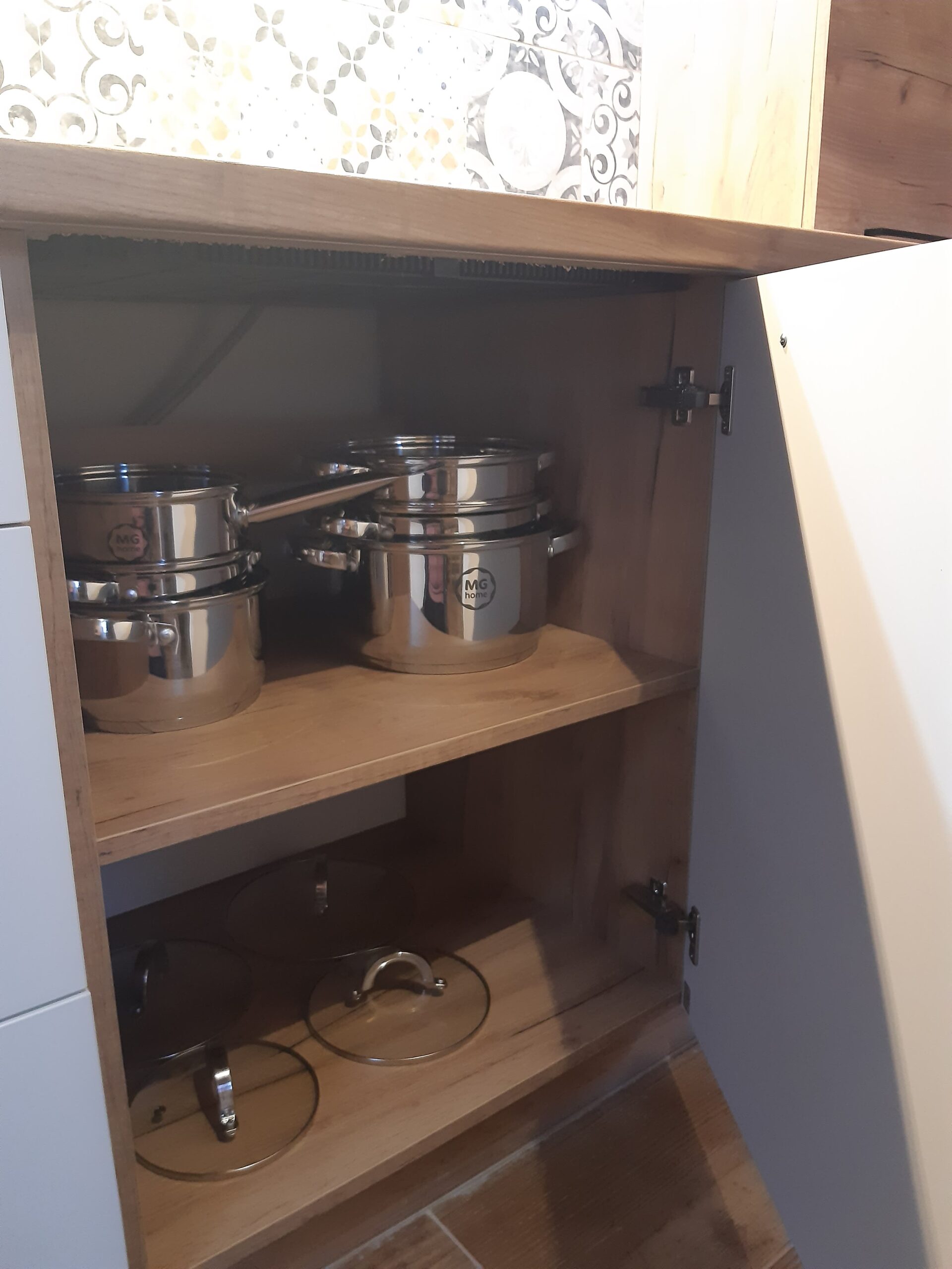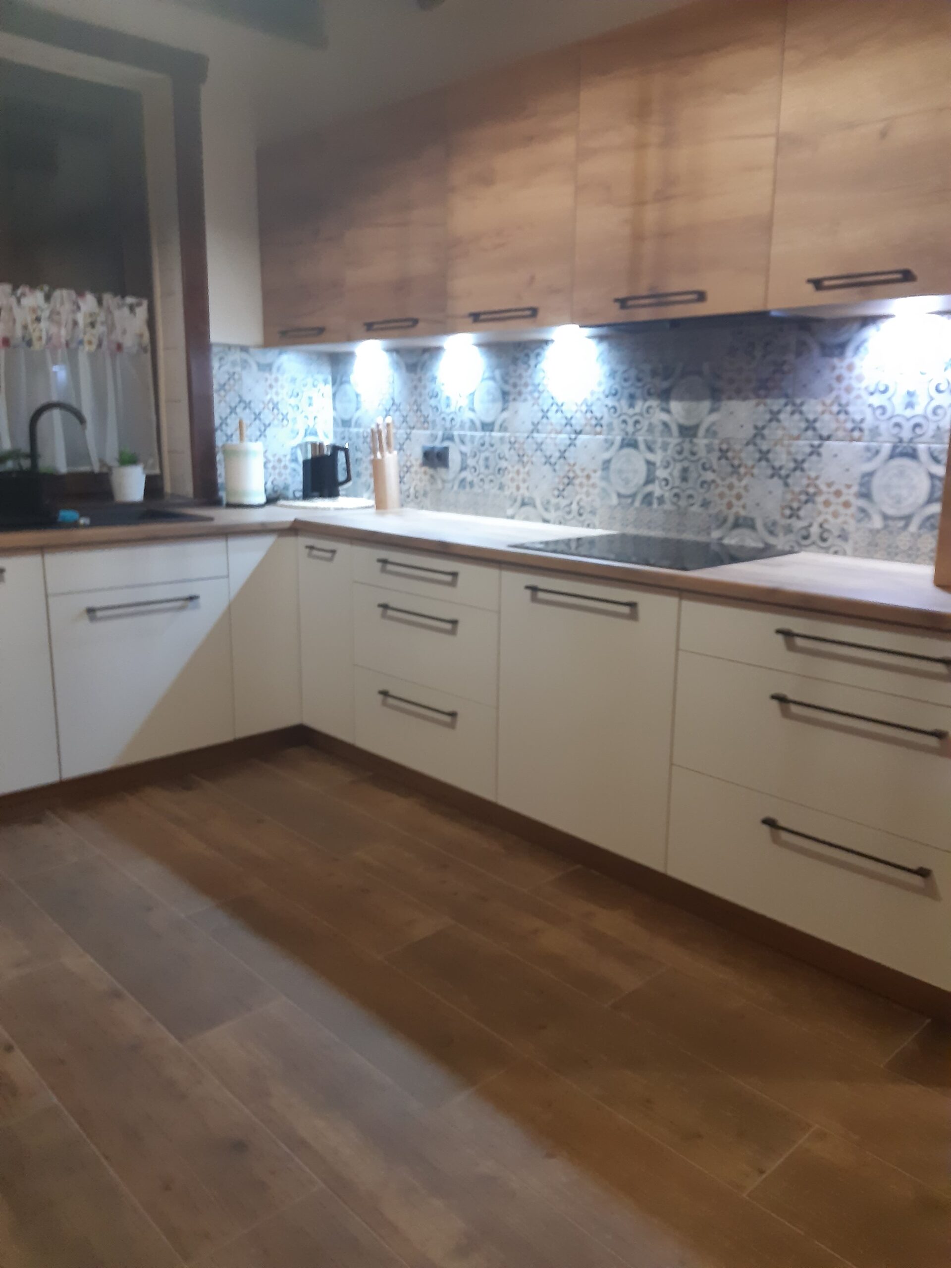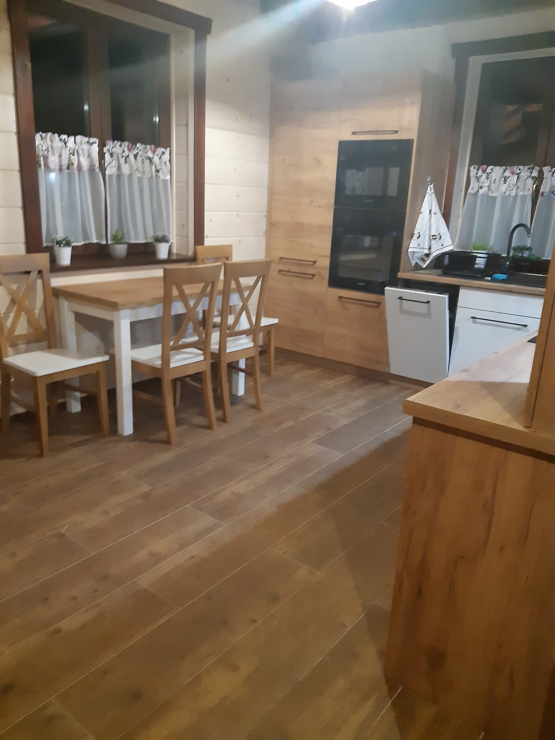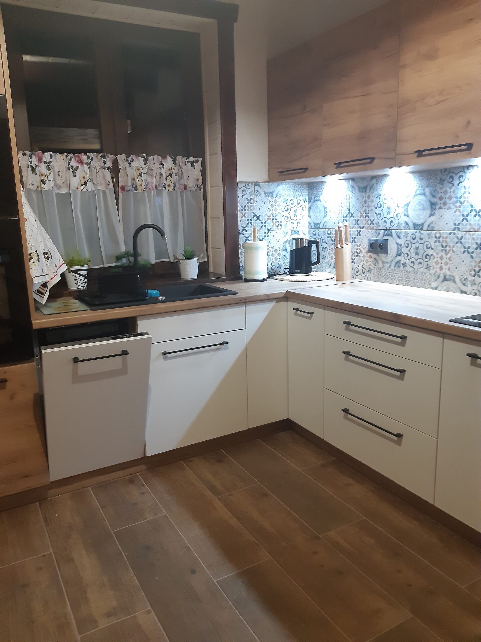 Kuchnia jest oddzielona od salonu. W pełni wyposażona: lodówka z zamrażalnikiem, zabudowana mikrofalówka i piekarnik, zmywarka, płyta indukcyjna, stół z krzesłami, czajnik, mikser, naczynia, garnki, sztućce i wszystkie niezbędne rzeczy..