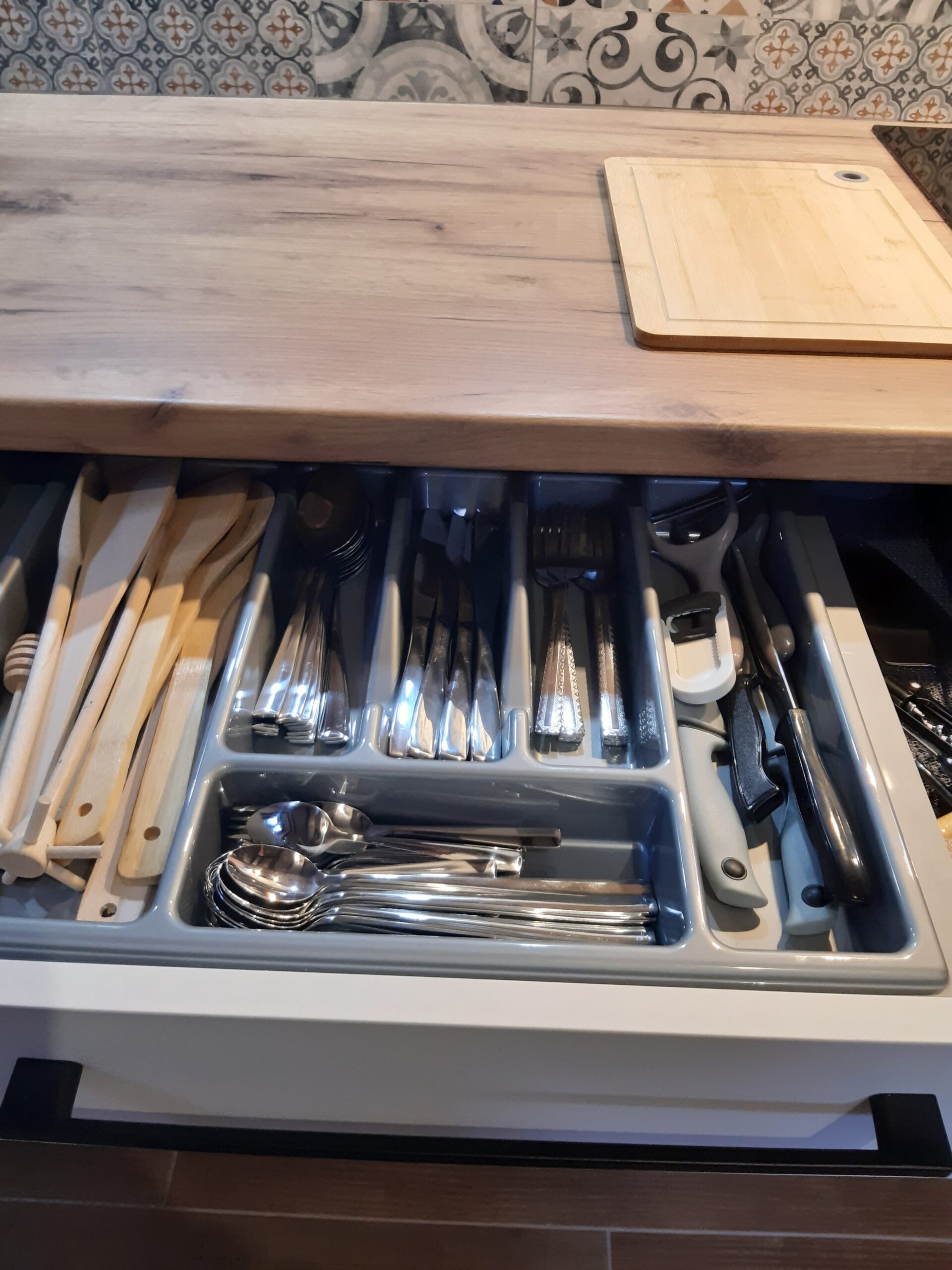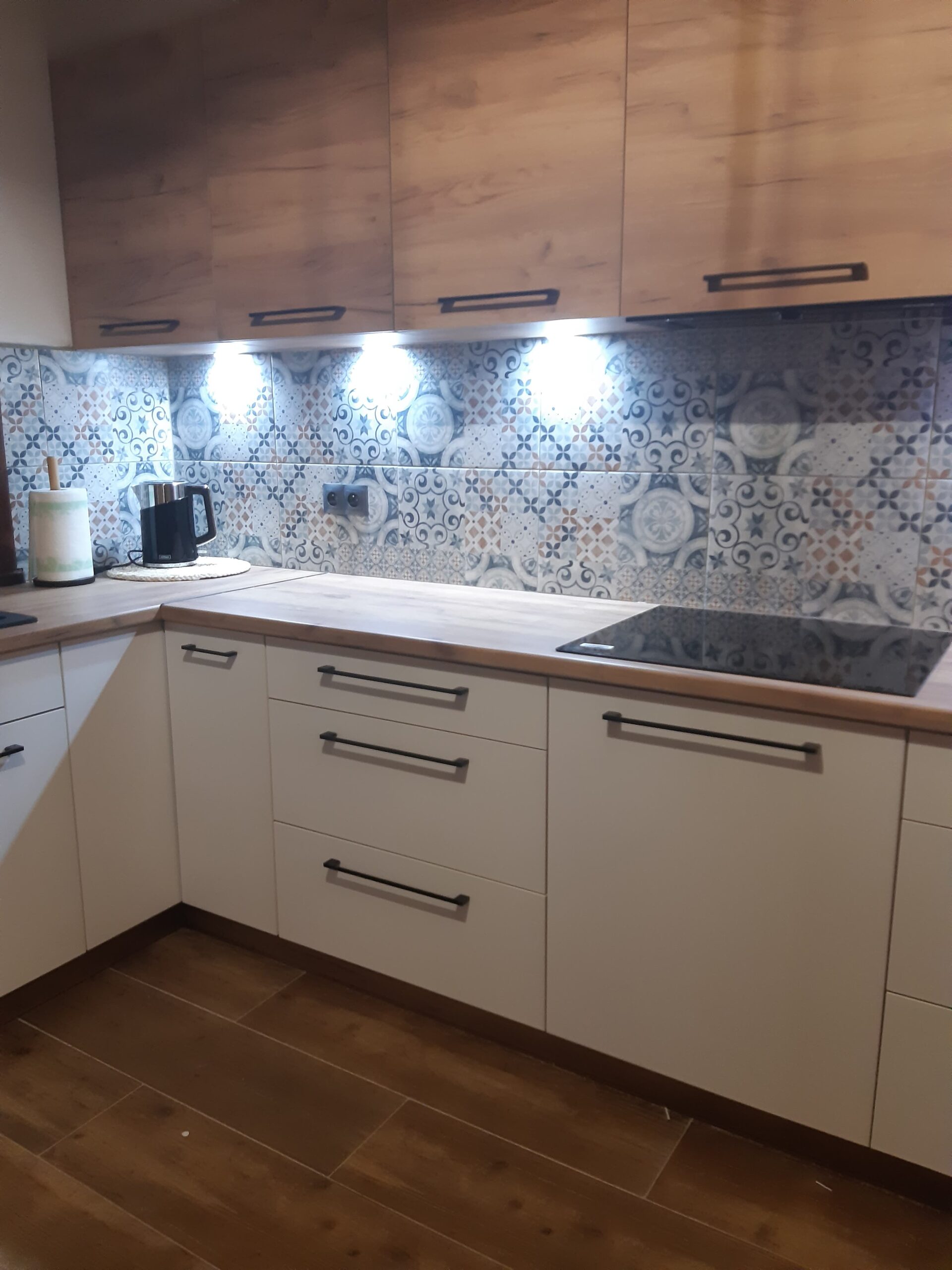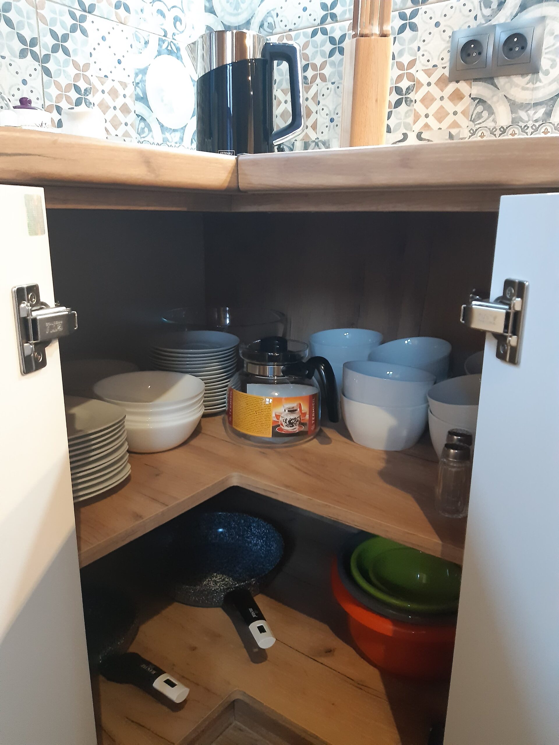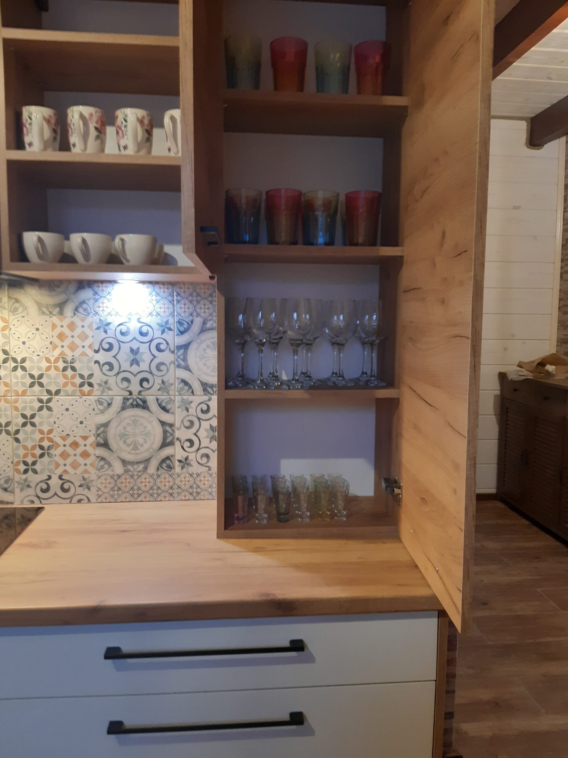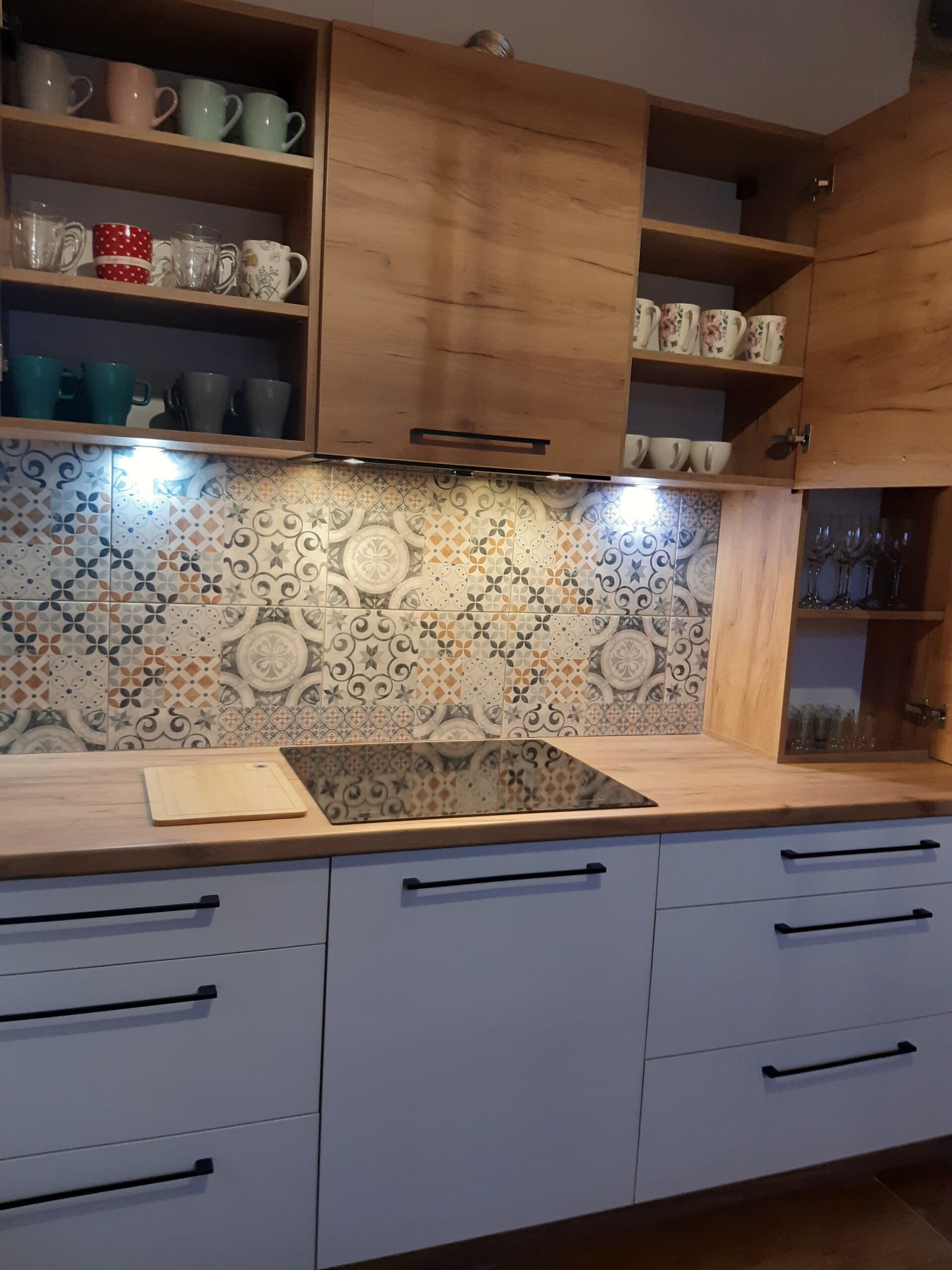 Kuchnia jest oddzielona od salonu. W pełni wyposażona: lodówka z zamrażalnikiem, zabudowana mikrofalówka i piekarnik, zmywarka, płyta indukcyjna, stół z krzesłami, czajnik, mikser, naczynia, garnki, sztućce i wszystkie niezbędne rzeczy..
