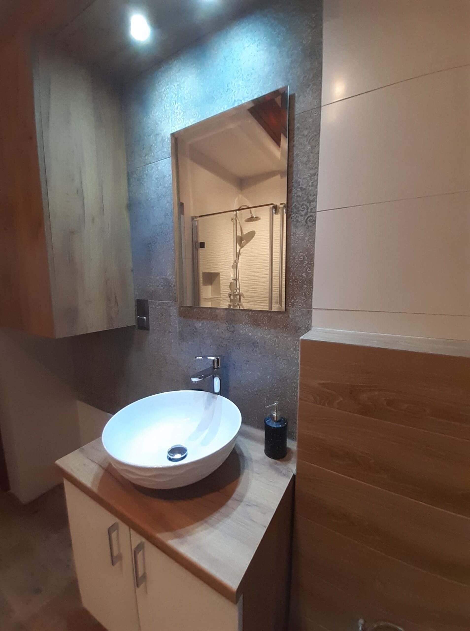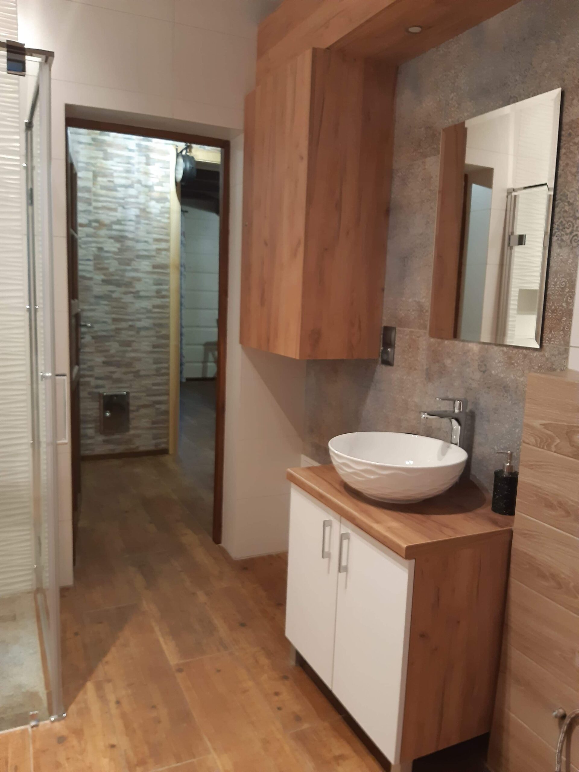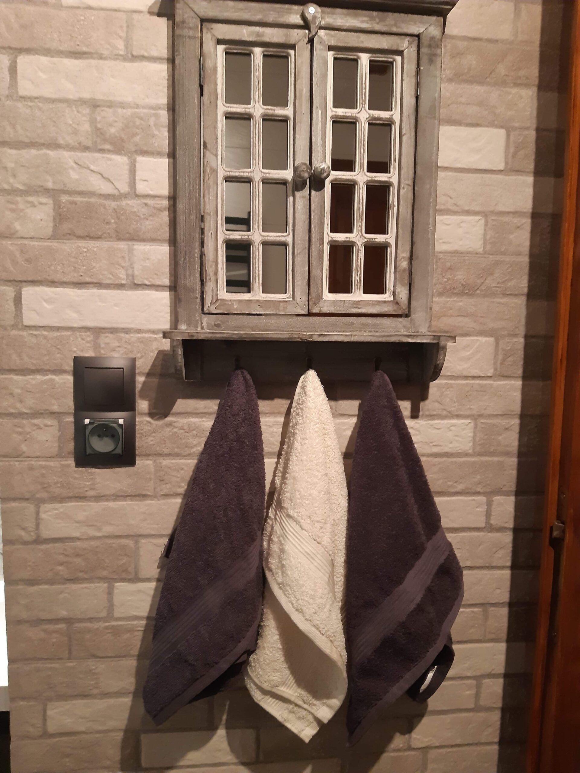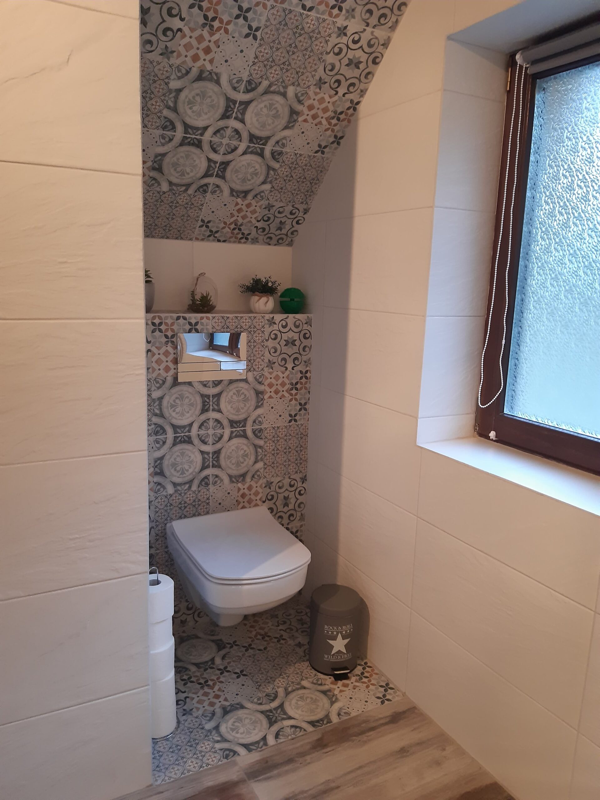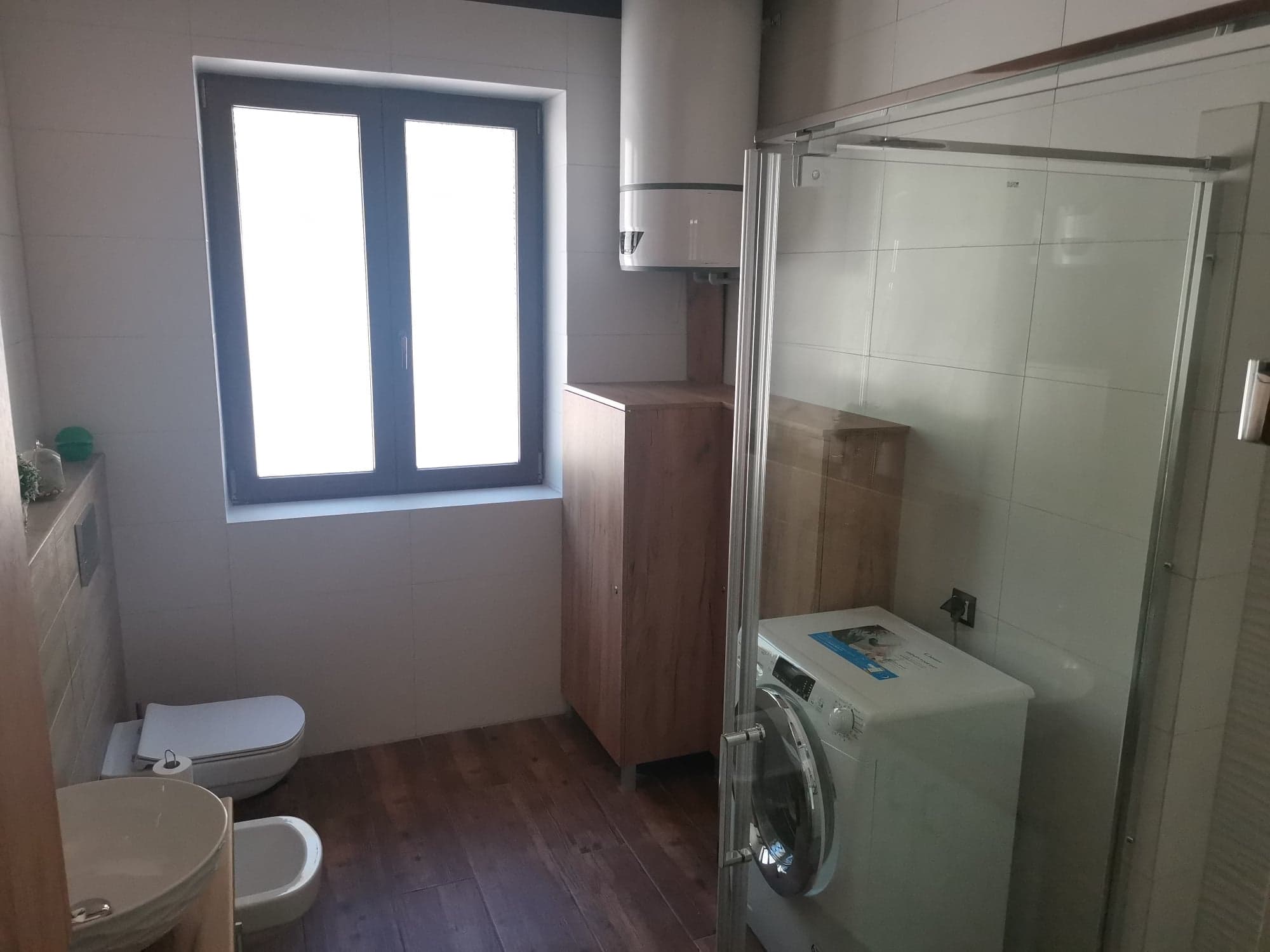 Na dole znajduje się łazienka z prysznicem, wc, bidetem, umywalką i pralką. Na górze znajduje się łazienka z prysznicem, wc i umywalką.