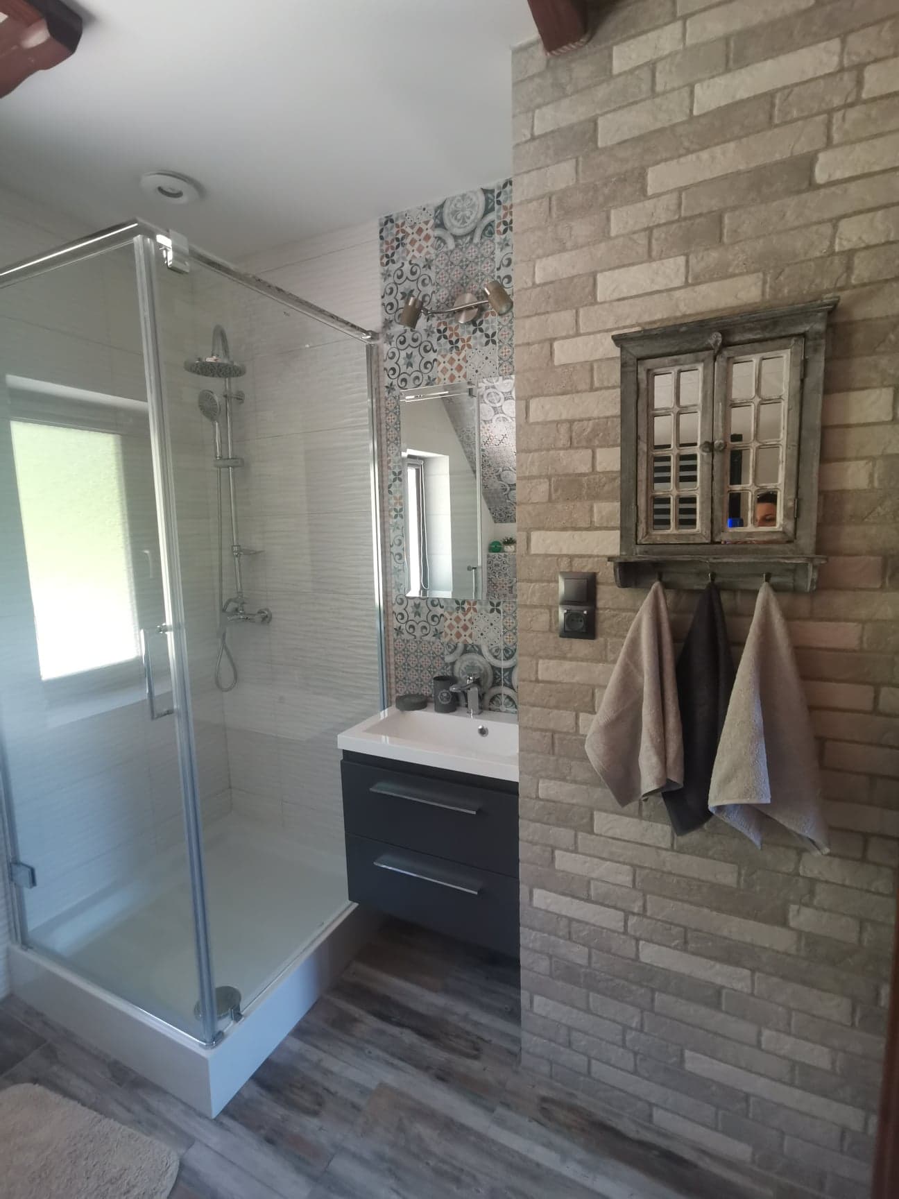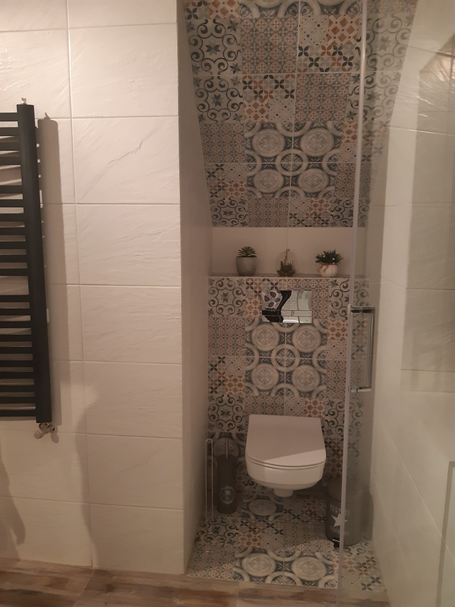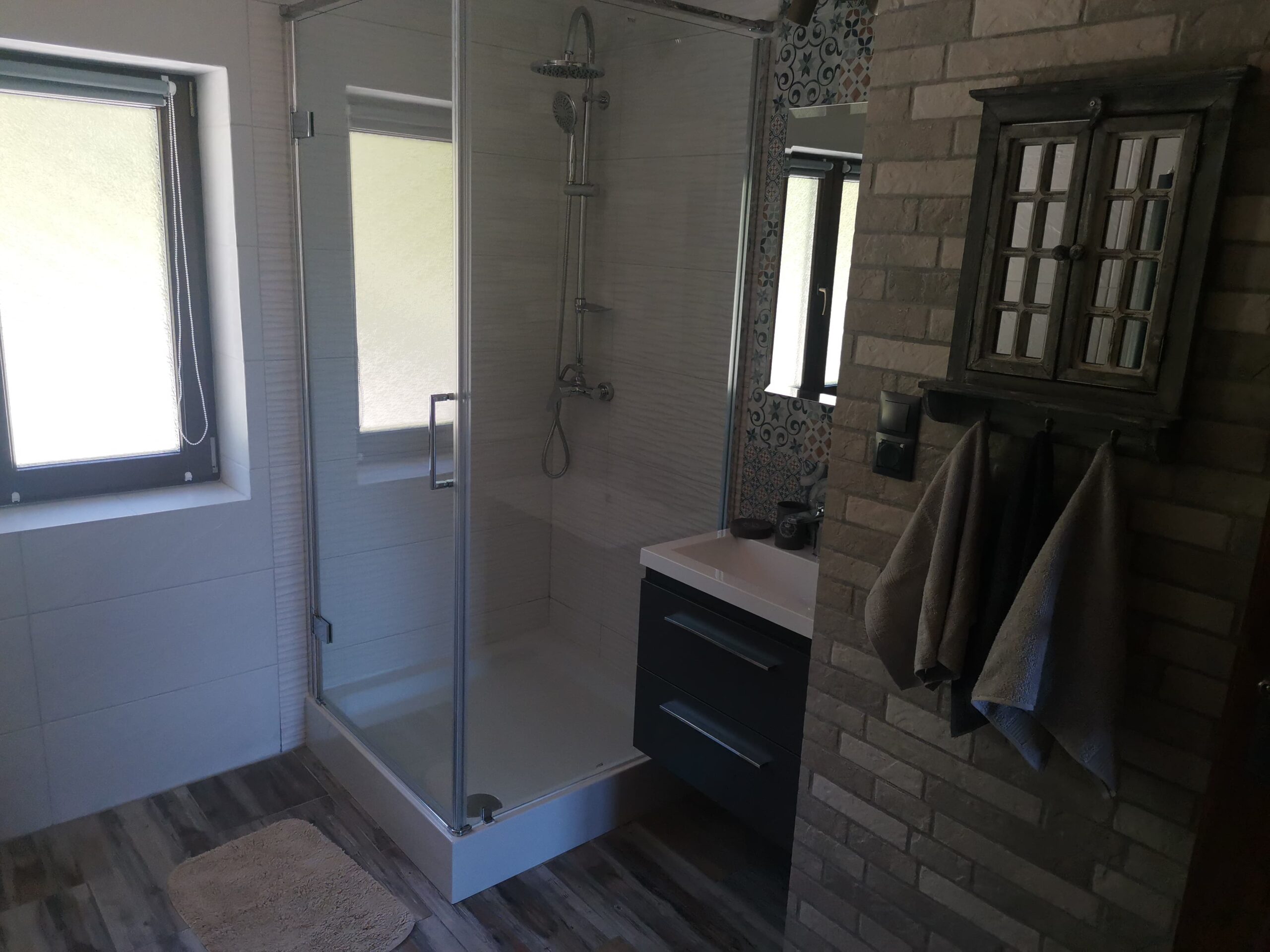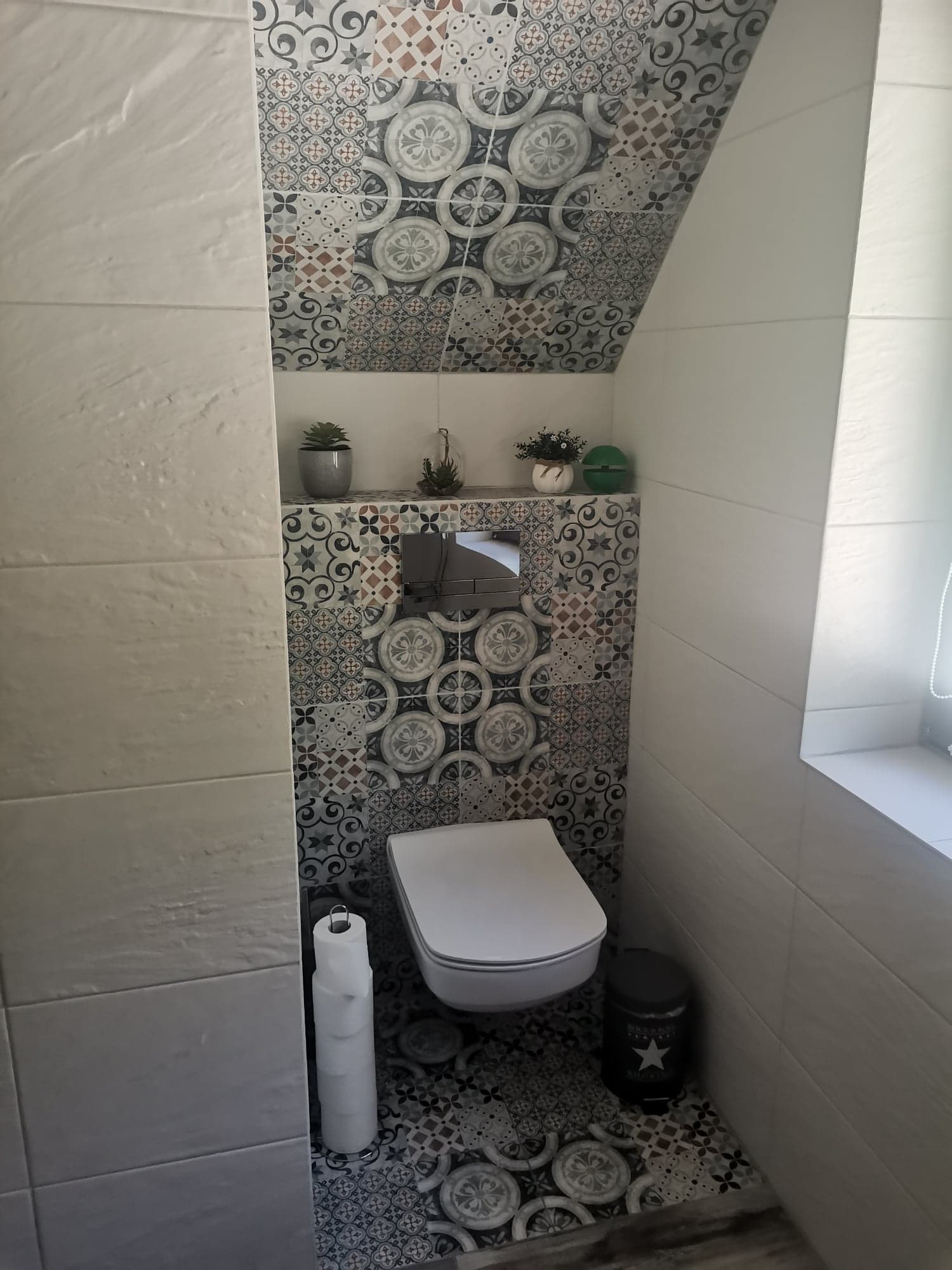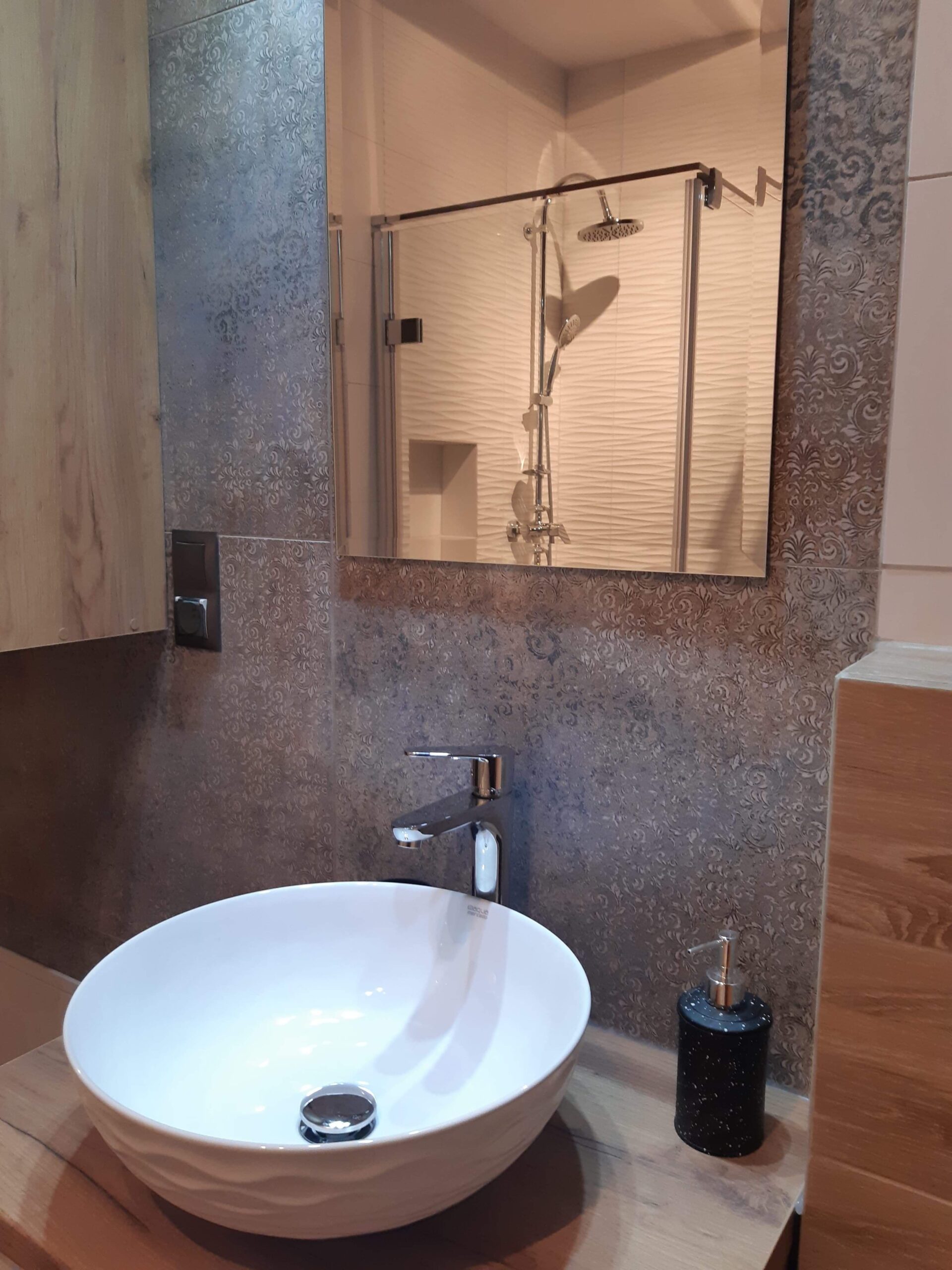 Na dole znajduje się łazienka z prysznicem, wc, bidetem, umywalką i pralką. Na górze znajduje się łazienka z prysznicem, wc i umywalką.