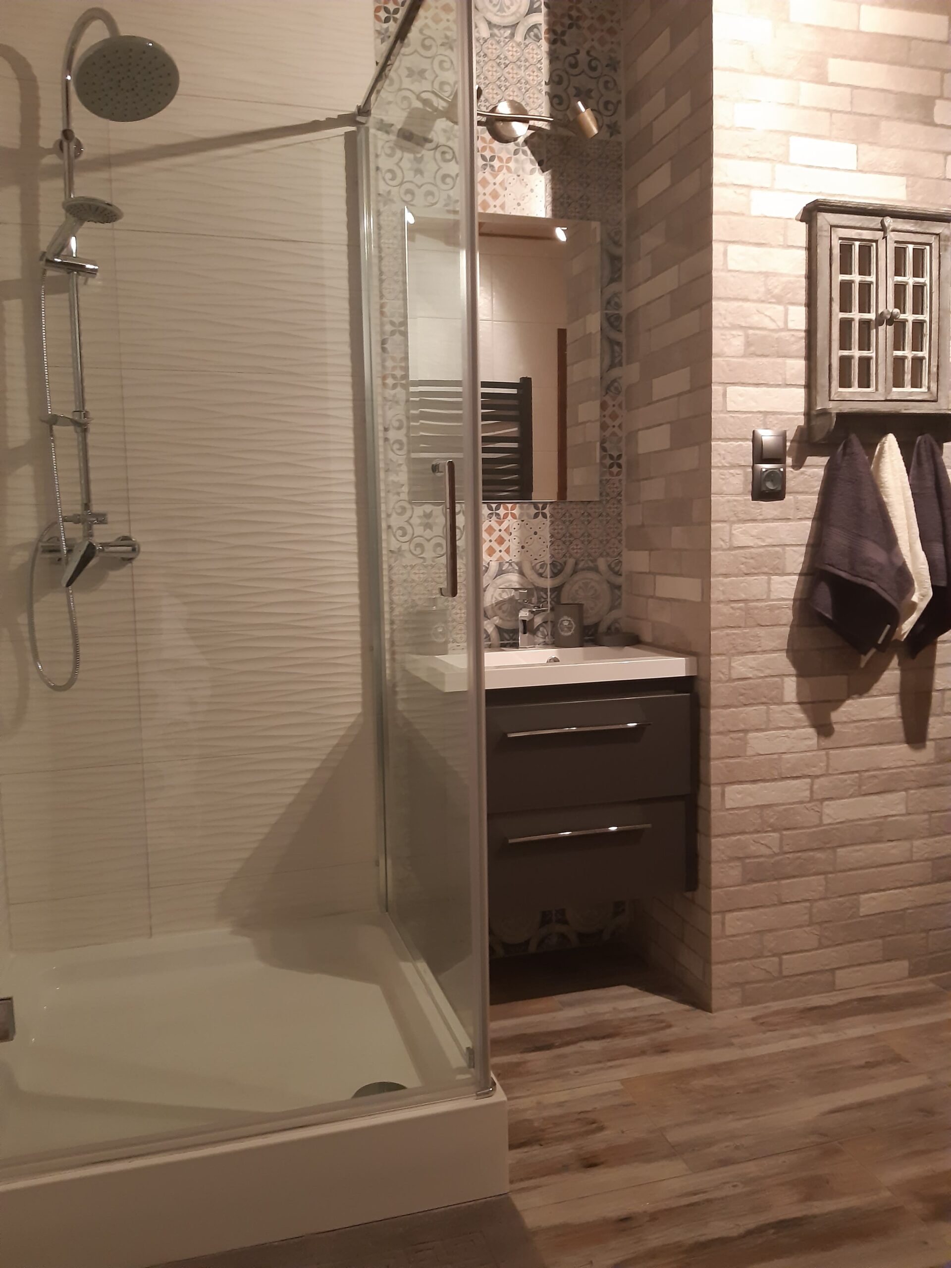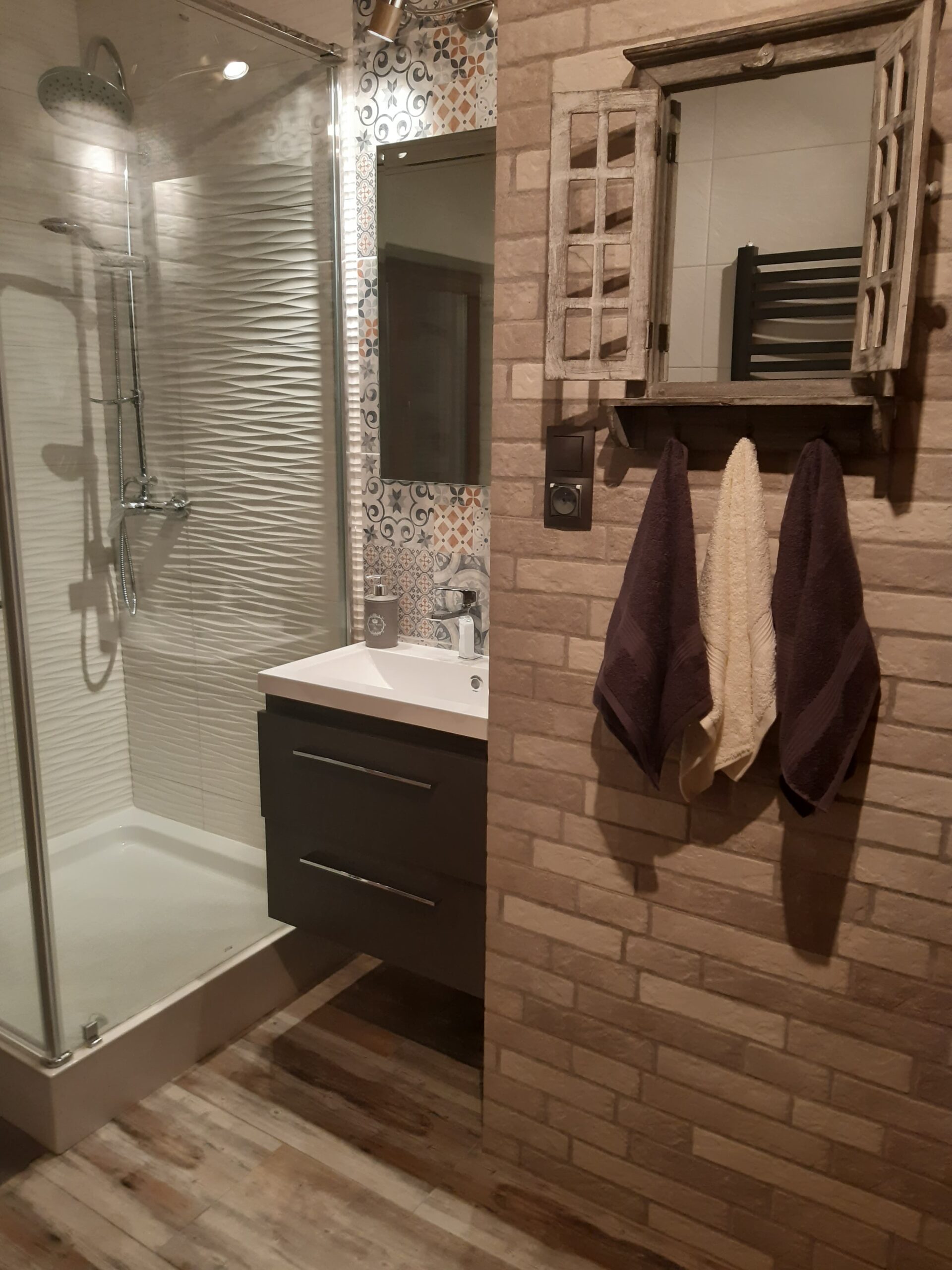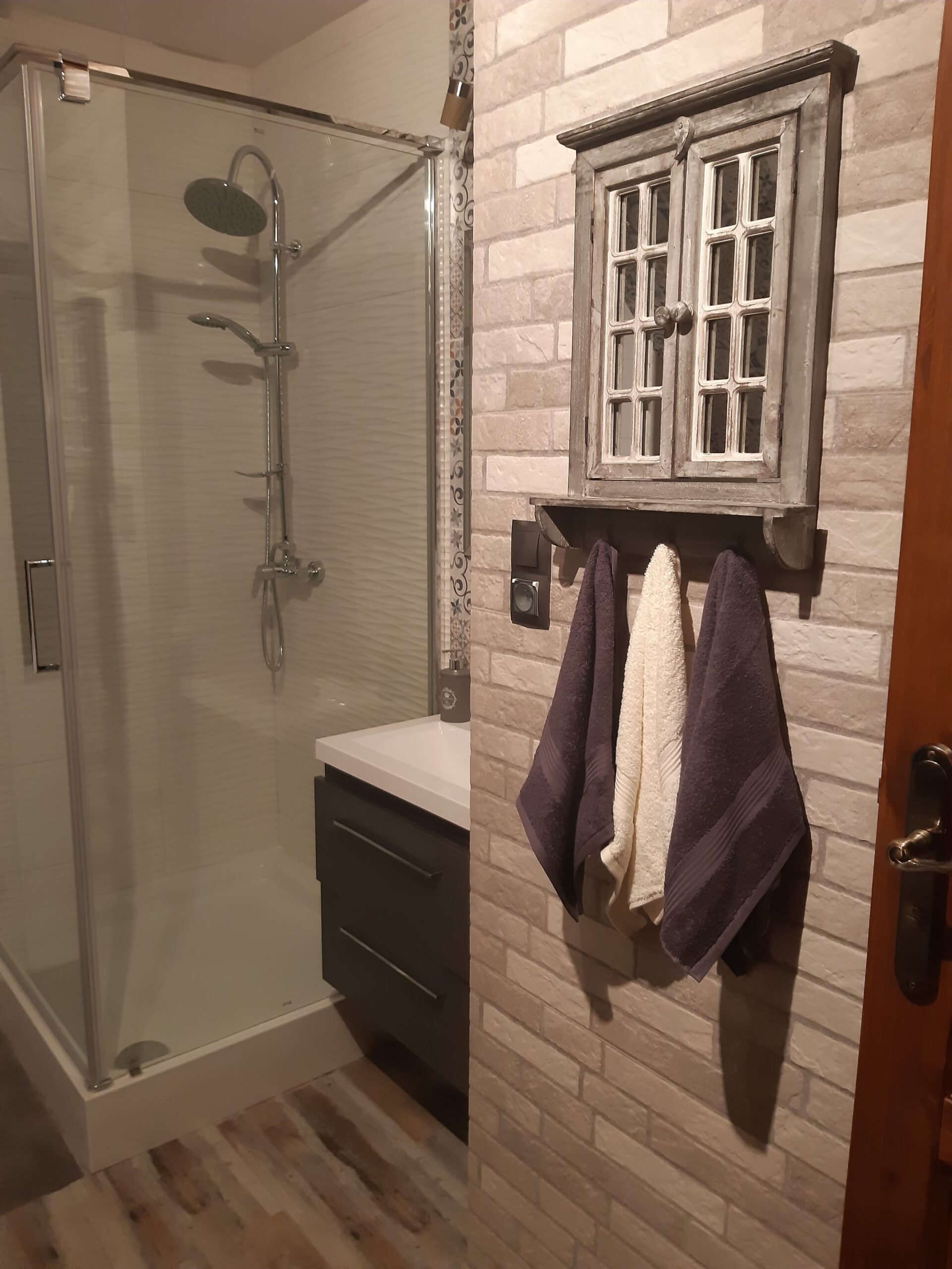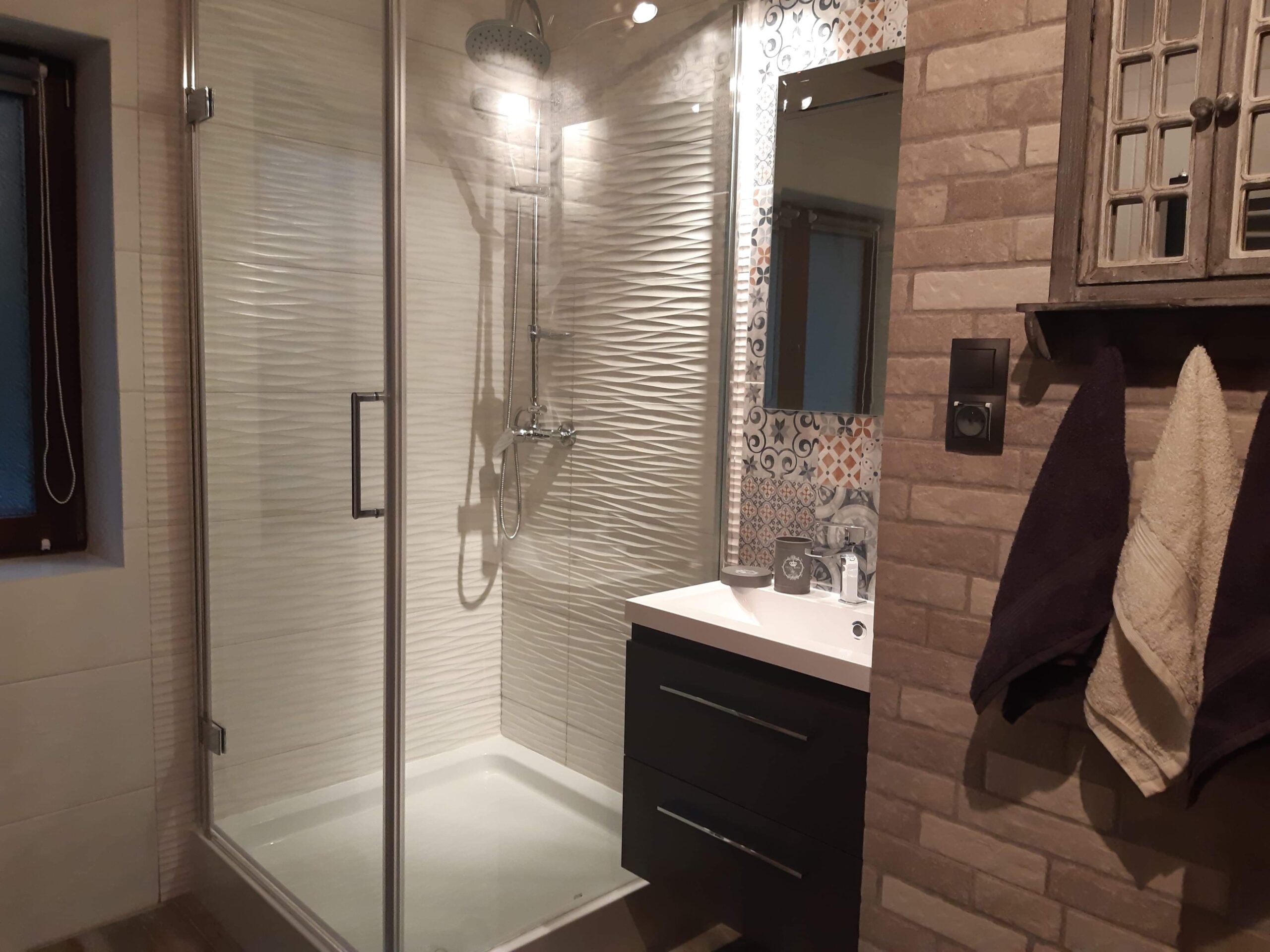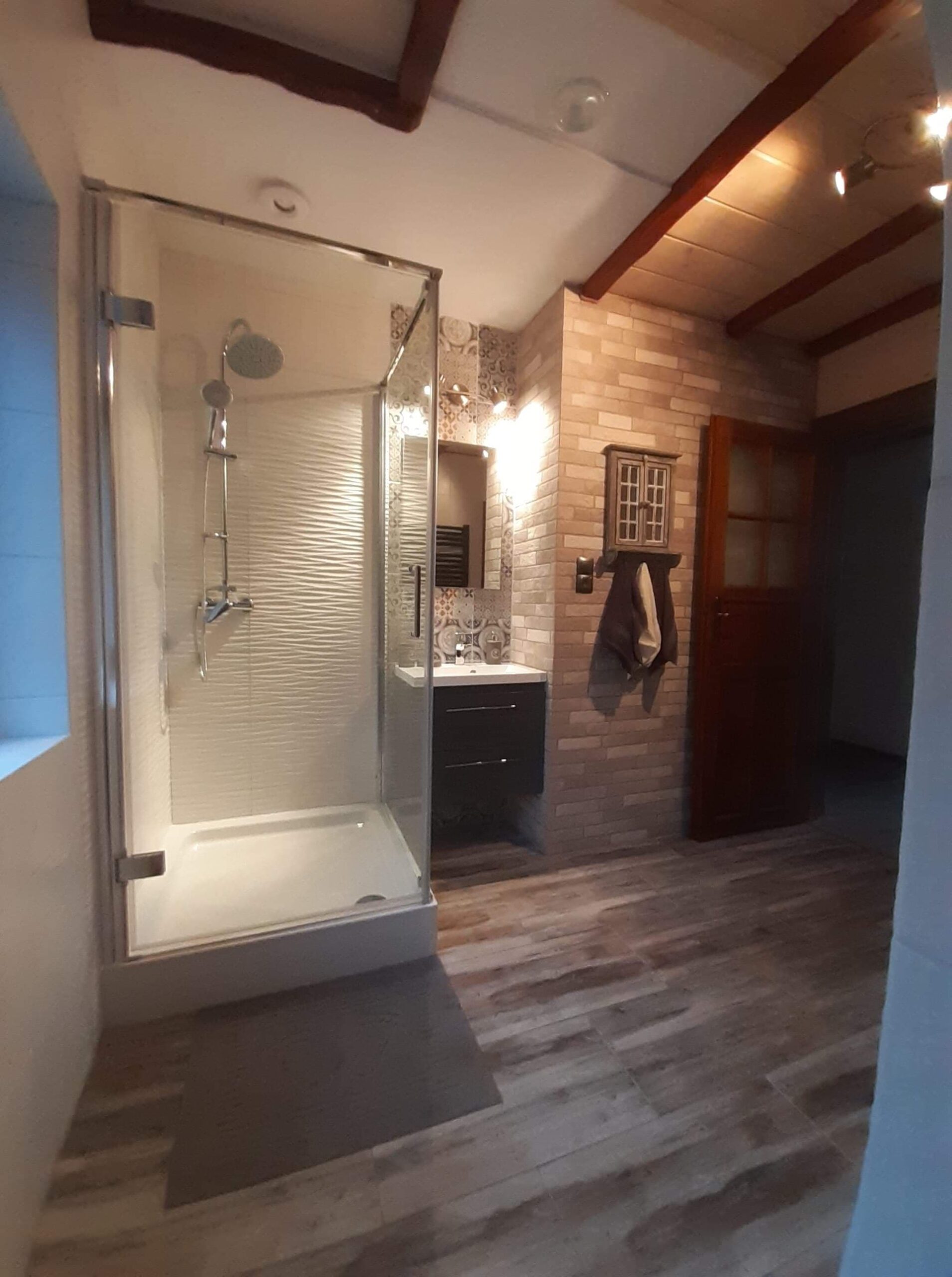 Na dole znajduje się łazienka z prysznicem, wc, bidetem, umywalką i pralką. Na górze znajduje się łazienka z prysznicem, wc i umywalką.