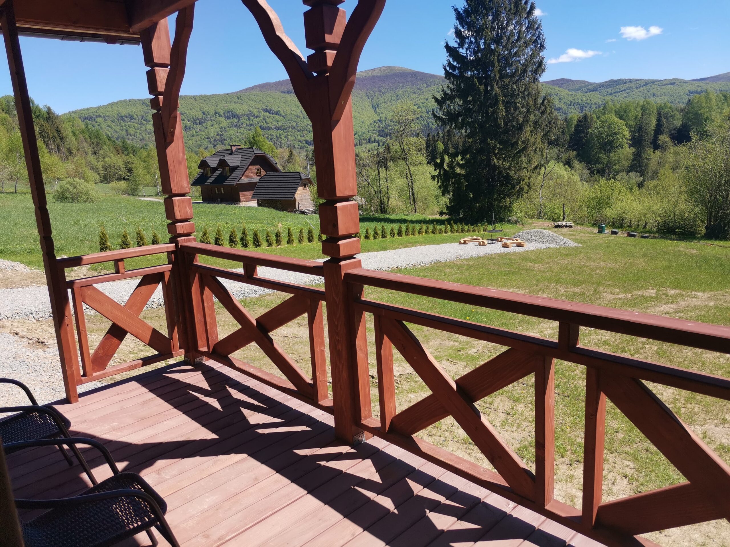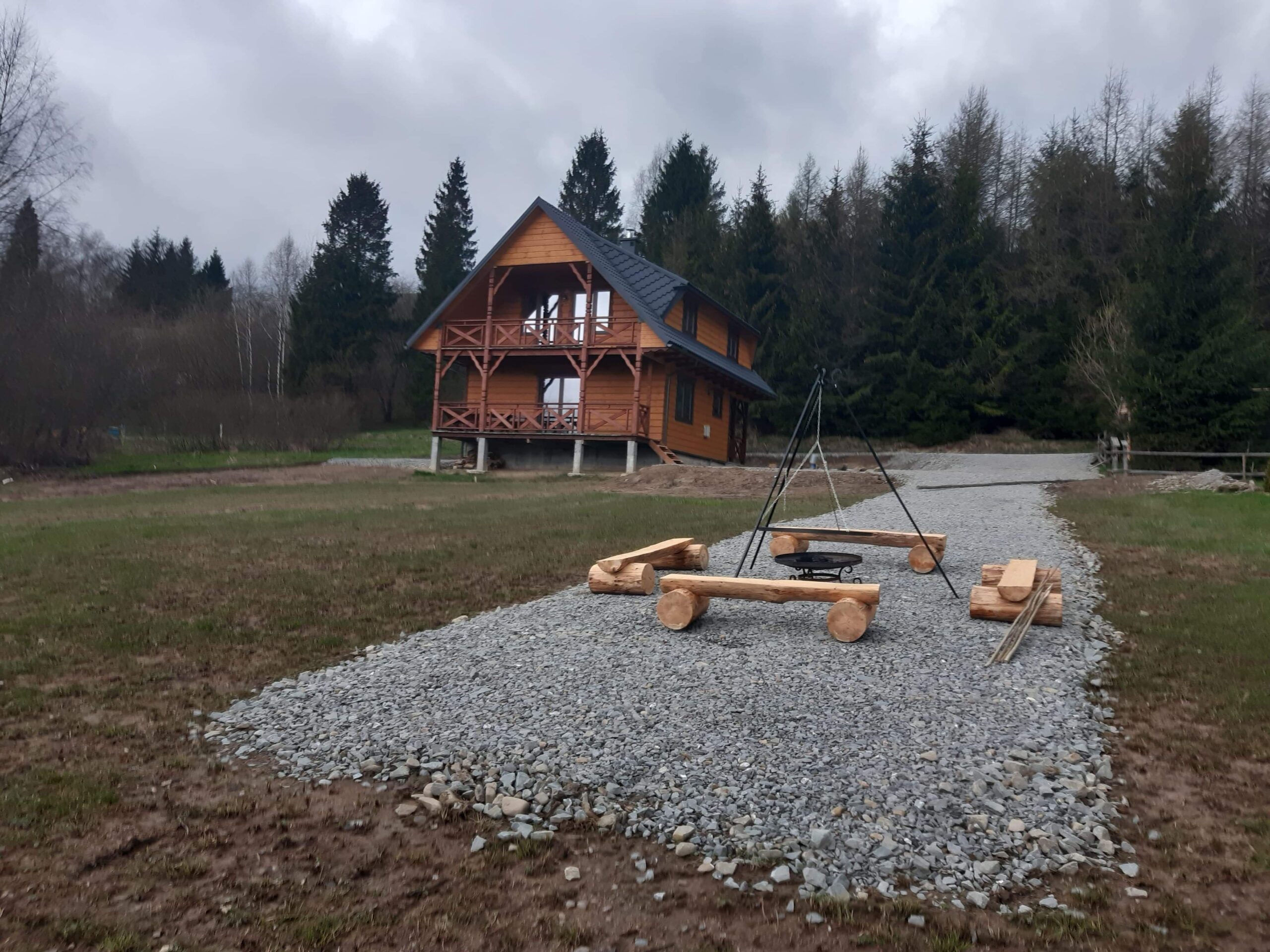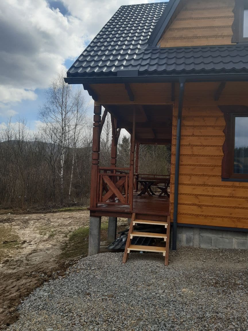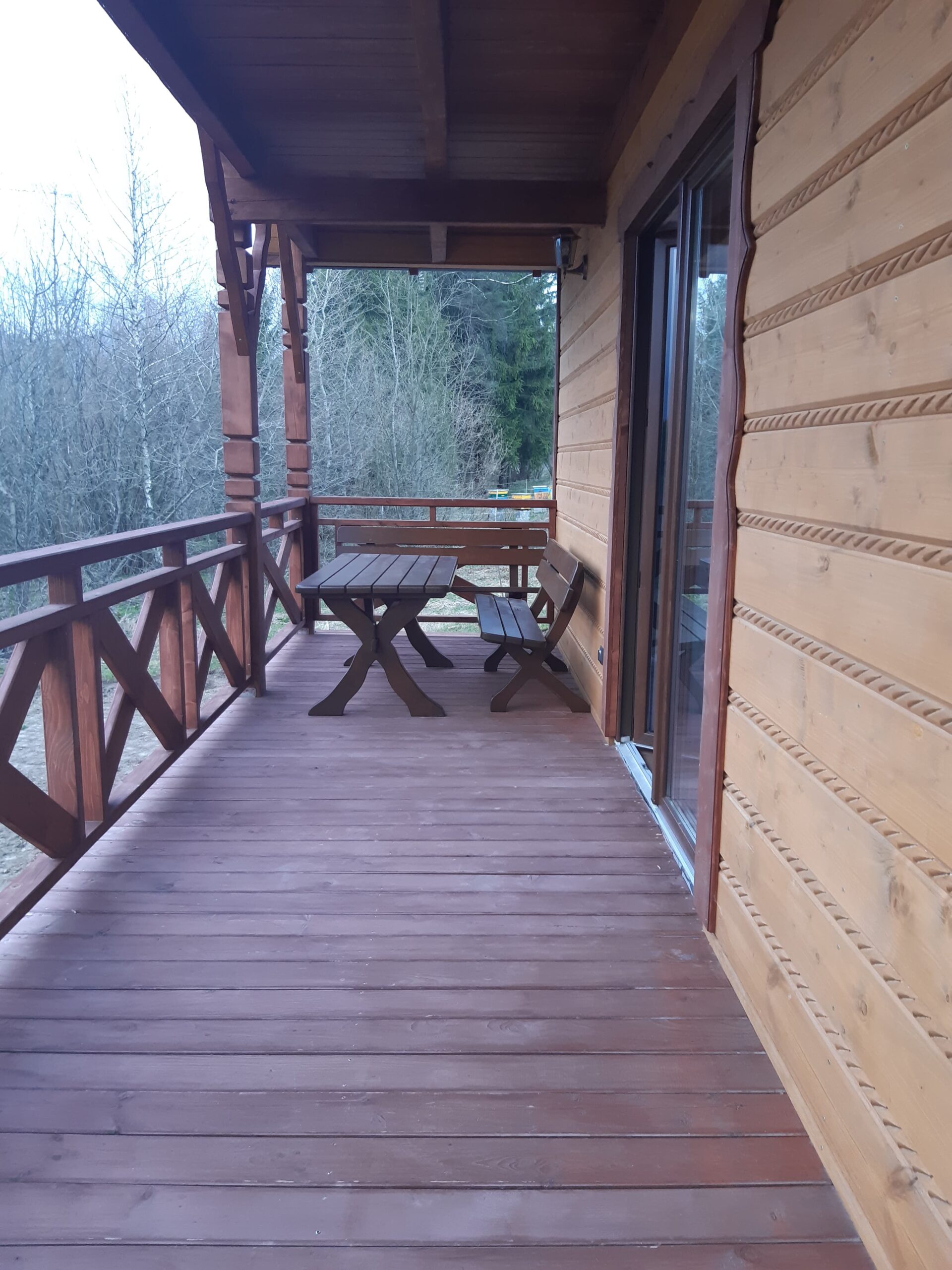 Bezpośrednio z salonu mogą Państwo wyjść na taras wyposażony w drewniane meble ogrodowe projektowane i tworzone przez Właściciela. Obok domku znajduje się miejsce na zapalenie grilla czy ogniska oraz miejsca parkingowe.