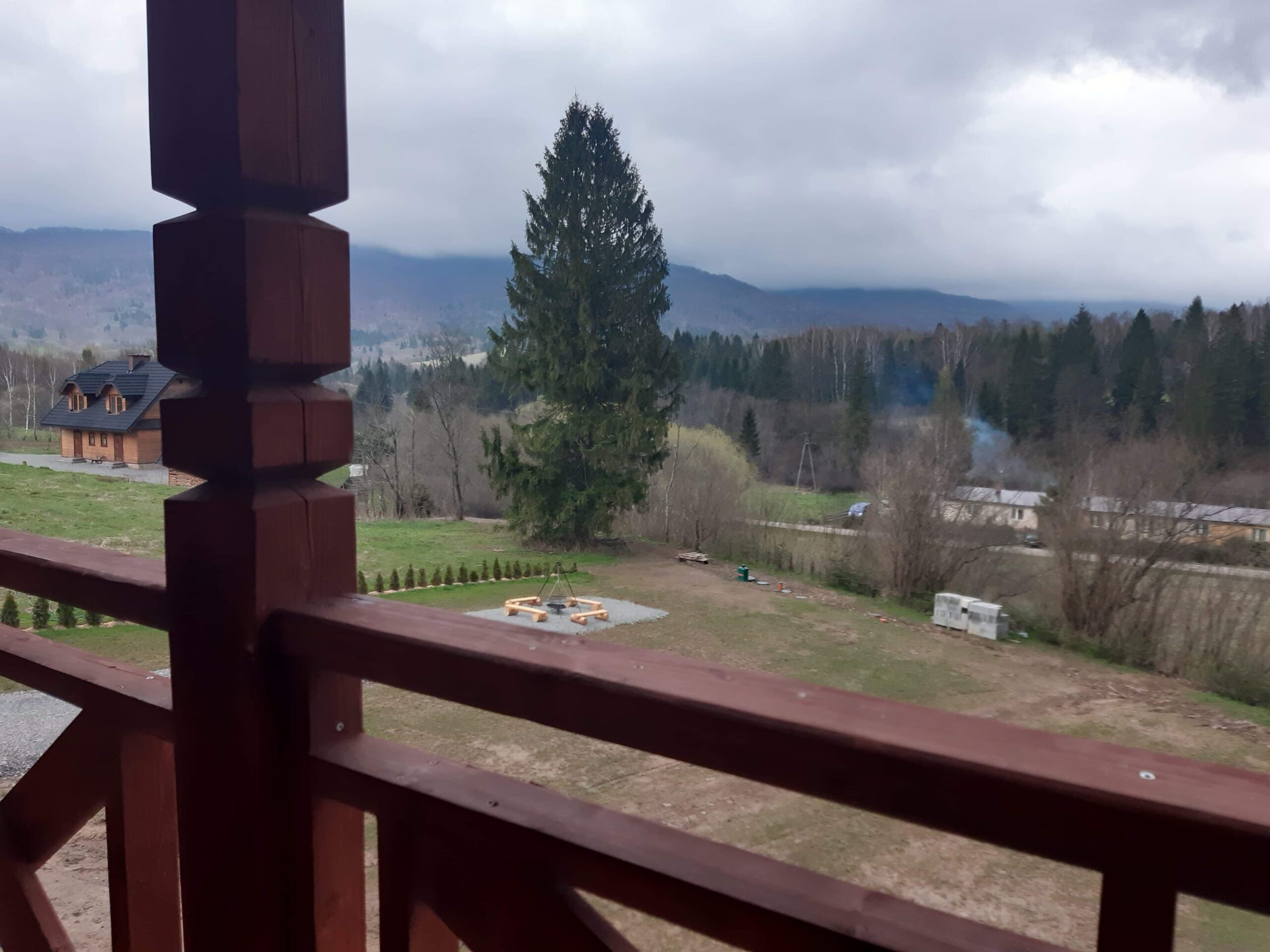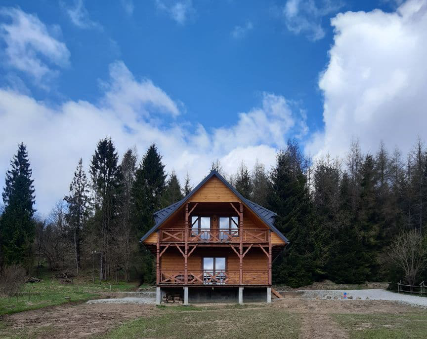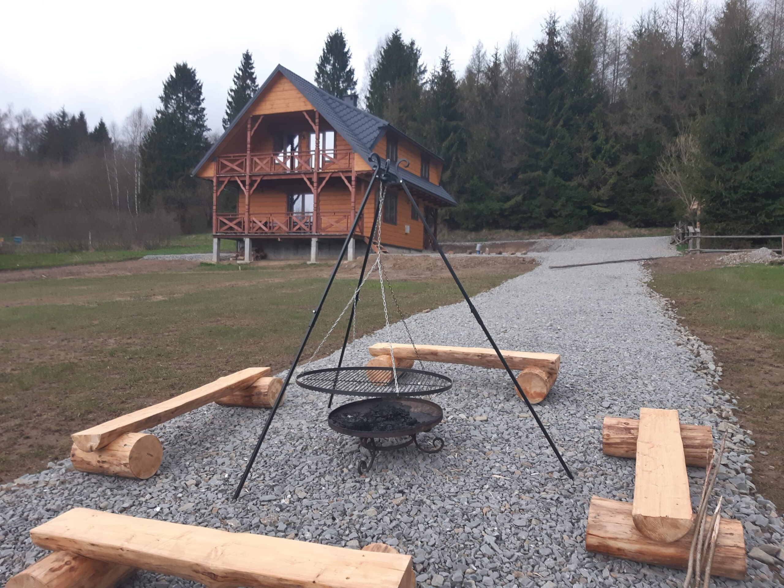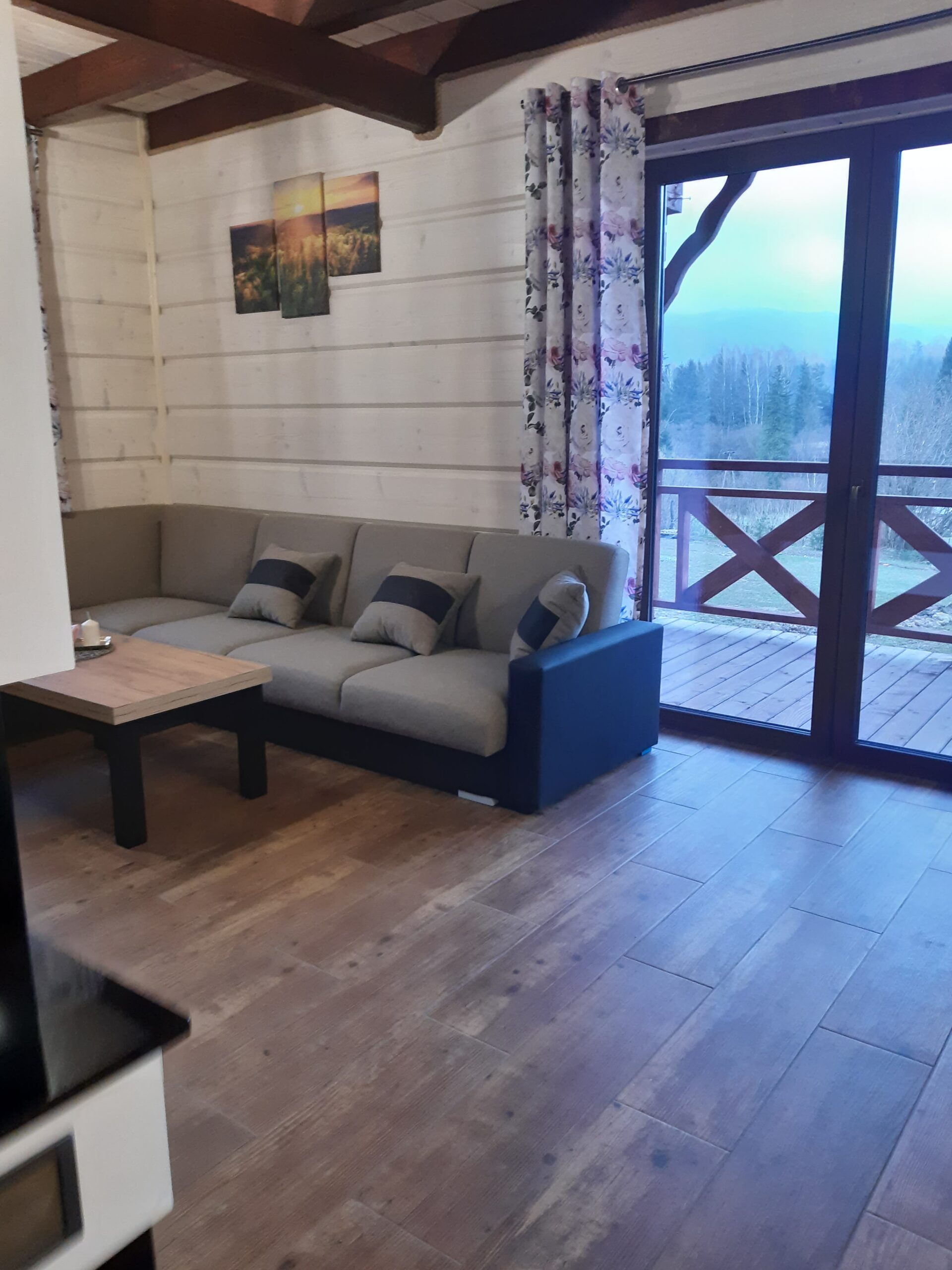 Bezpośrednio z salonu mogą Państwo wyjść na taras wyposażony w drewniane meble ogrodowe projektowane i tworzone przez Właściciela. Obok domku znajduje się miejsce na zapalenie grilla czy ogniska oraz miejsca parkingowe.