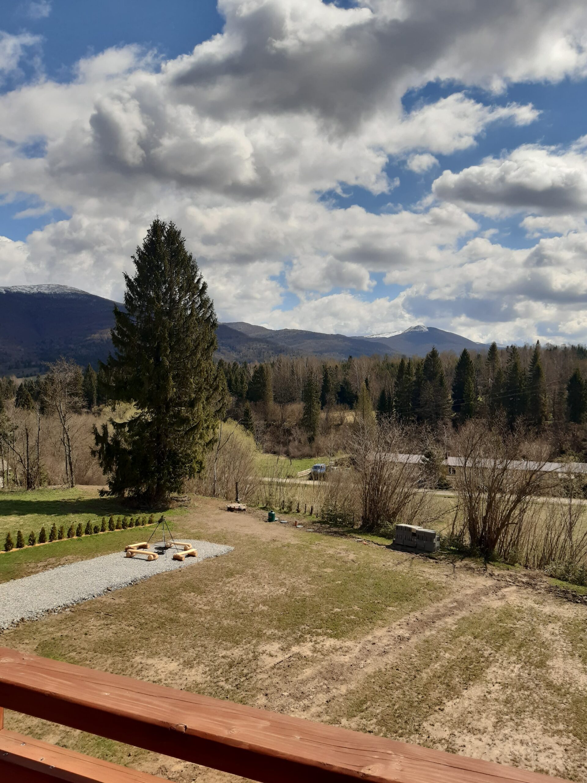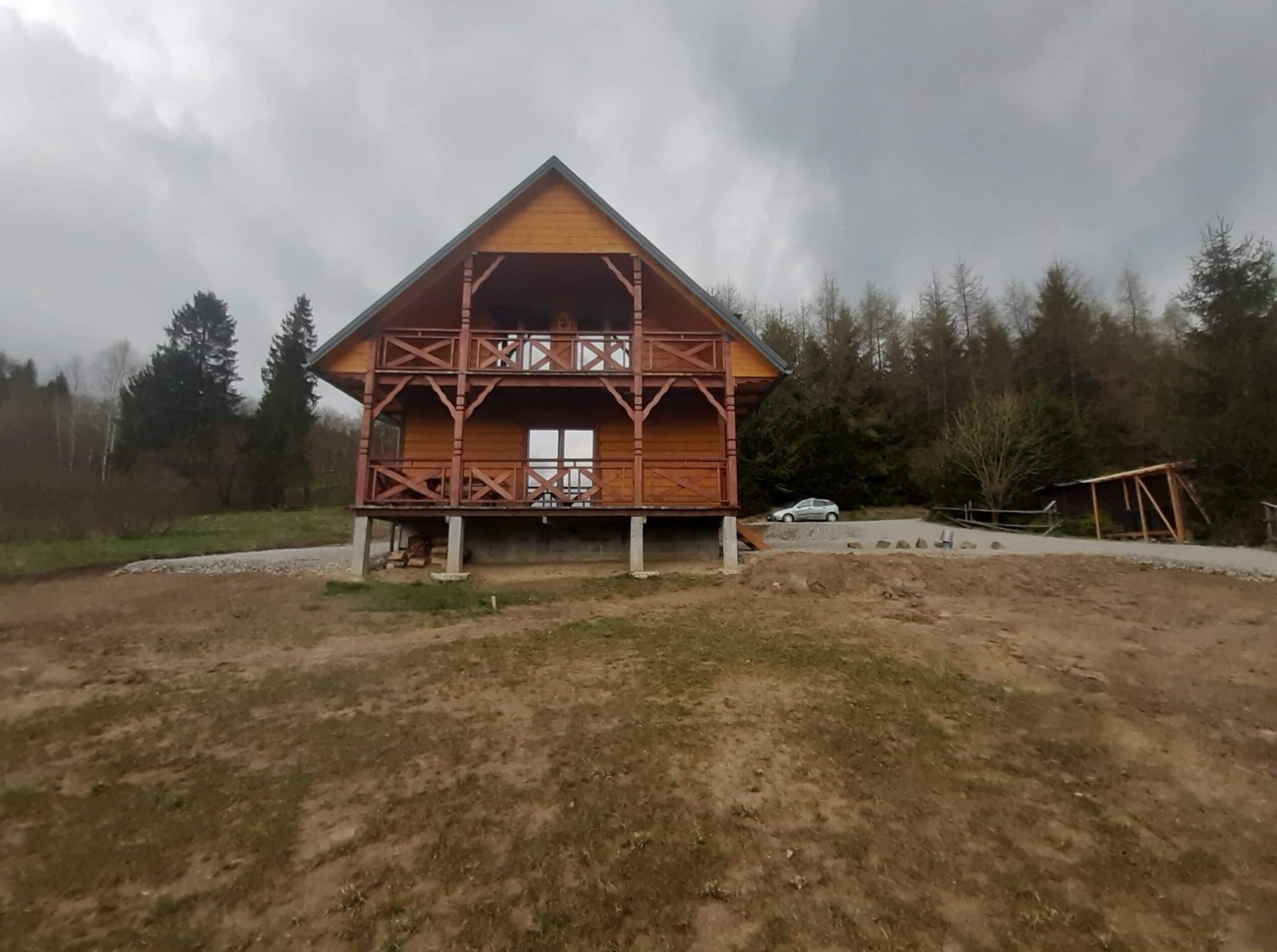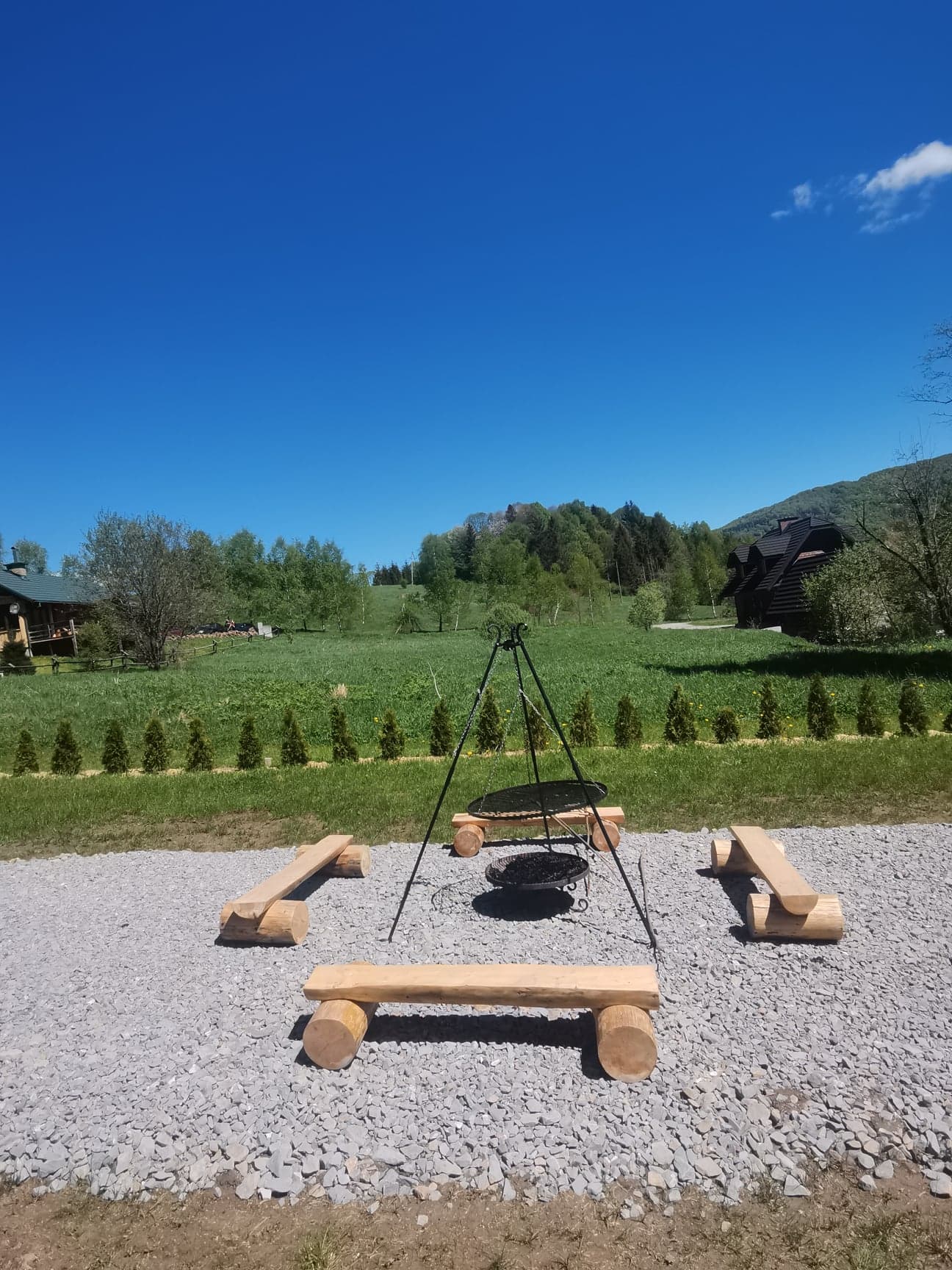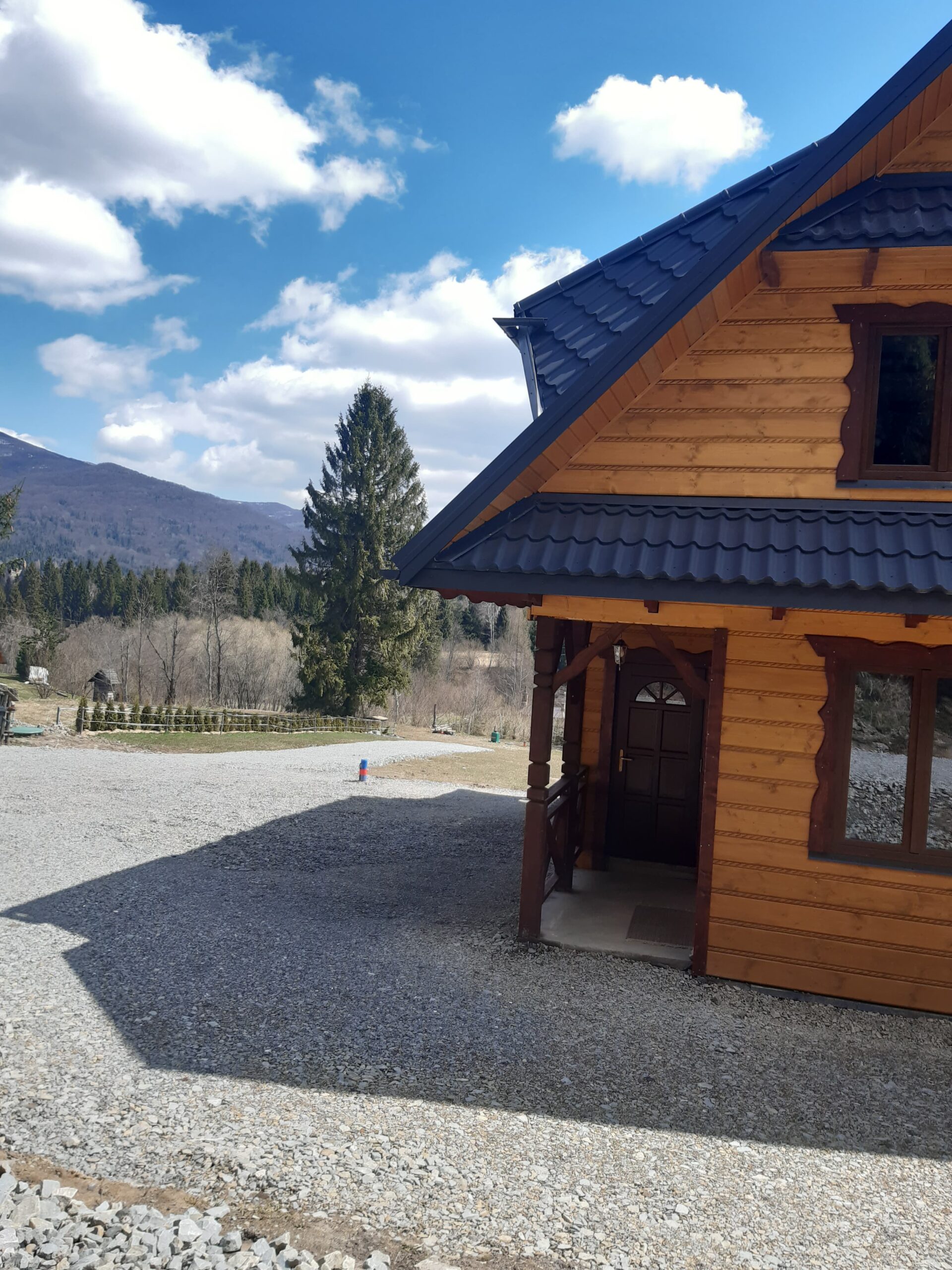 Bezpośrednio z salonu mogą Państwo wyjść na taras wyposażony w drewniane meble ogrodowe projektowane i tworzone przez Właściciela. Obok domku znajduje się miejsce na zapalenie grilla czy ogniska oraz miejsca parkingowe.